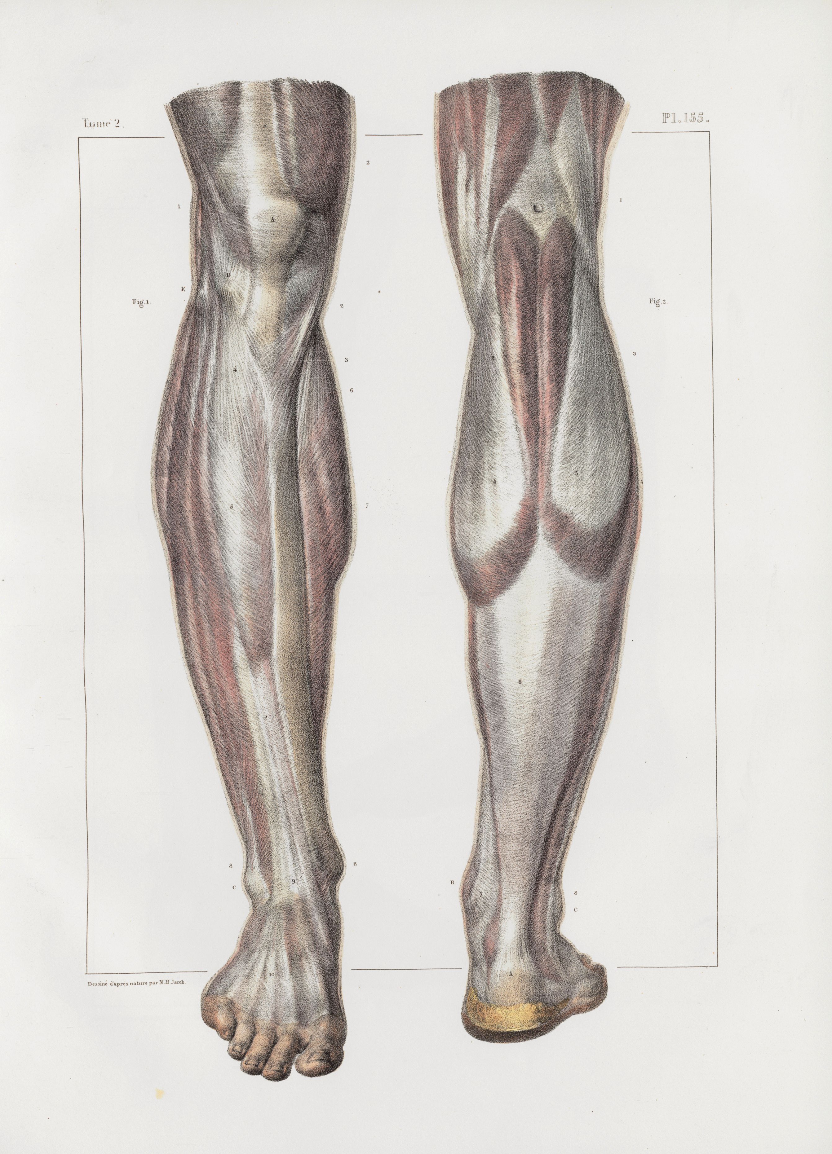 Planche 155 - Aponévroses de la jambe - Traité complet de l'anatomie de l'homme, par les Drs Bourgery et Claude Bernard et le professeur-dessinateur-anatomiste N.H. Jacob, avec le concours de Ludovic Hirschfeld. Tome deuxième.