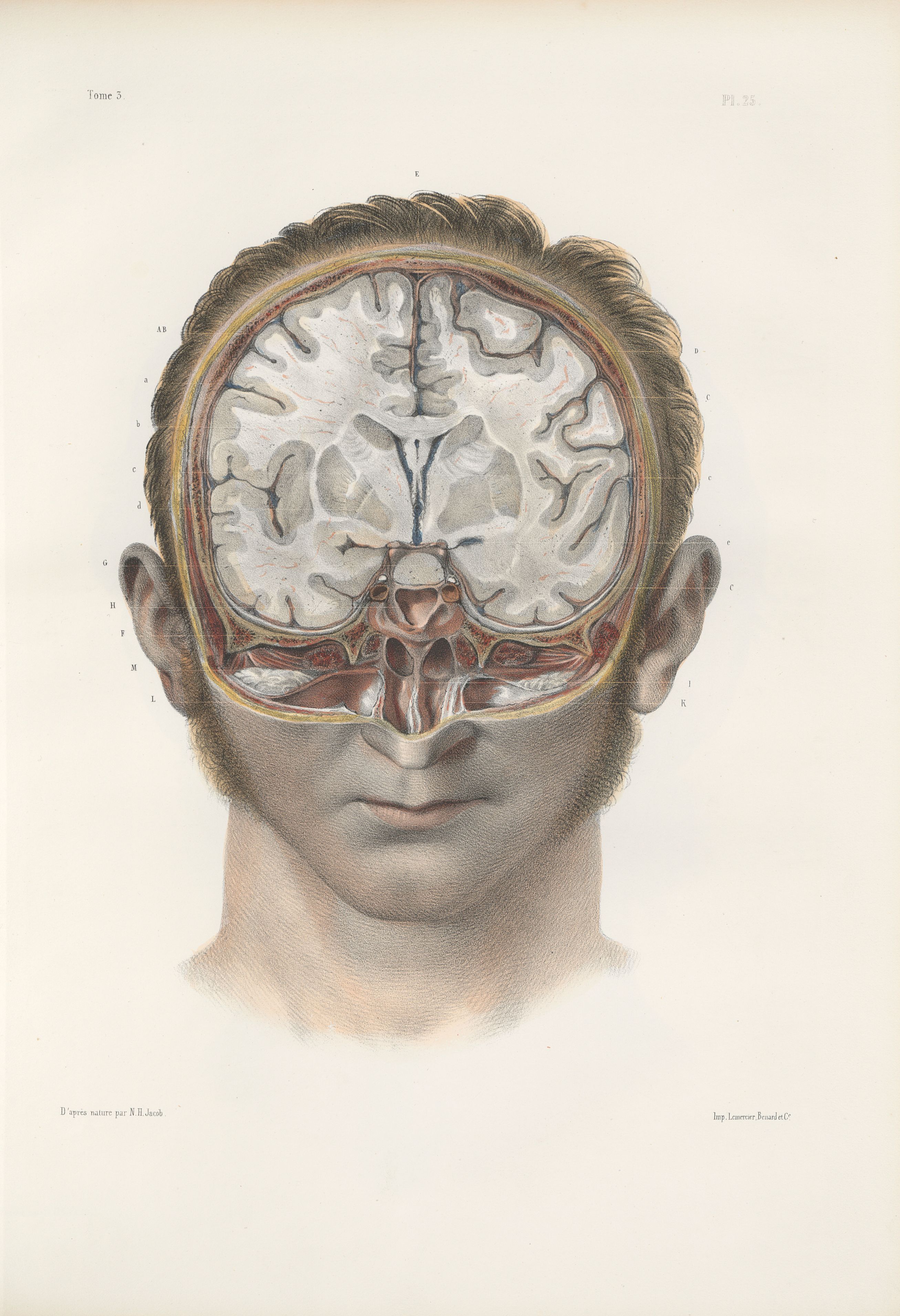 Planche 25 - Coupes verticales de l'encéphale suivant le diamètre transverse - Coupe verticale au-devant des oreilles - Traité complet de l'anatomie de l'homme, par les Drs Bourgery et Claude Bernard et le professeur-dessinateur-anatomiste N.H. Jacob, avec le concours de Ludovic Hirschfeld. Tome troisième.