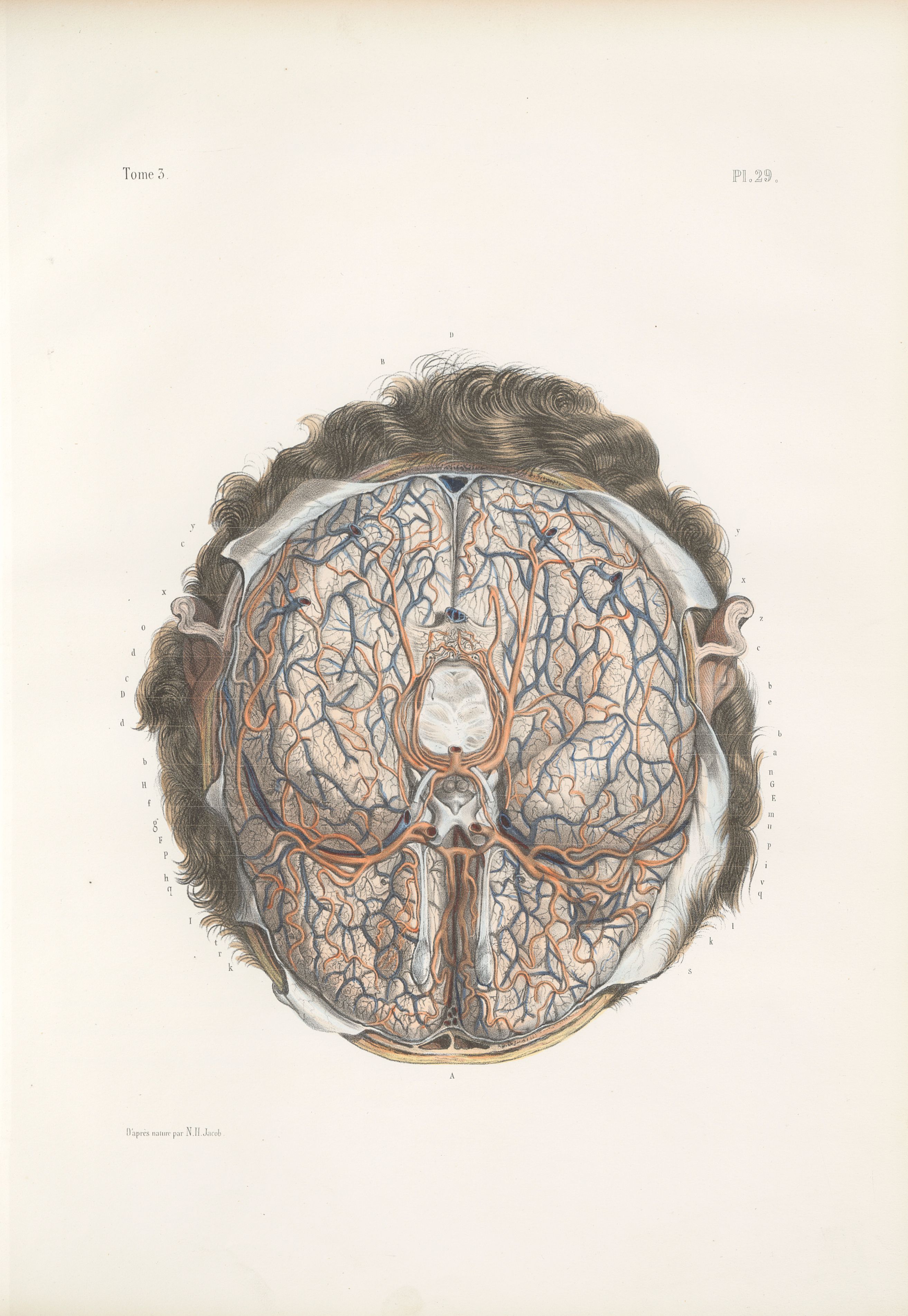 Planche 29 - Vaisseaux sanguins de la base du cerveau - Traité complet de l'anatomie de l'homme, par les Drs Bourgery et Claude Bernard et le professeur-dessinateur-anatomiste N.H. Jacob, avec le concours de Ludovic Hirschfeld. Tome troisième.
