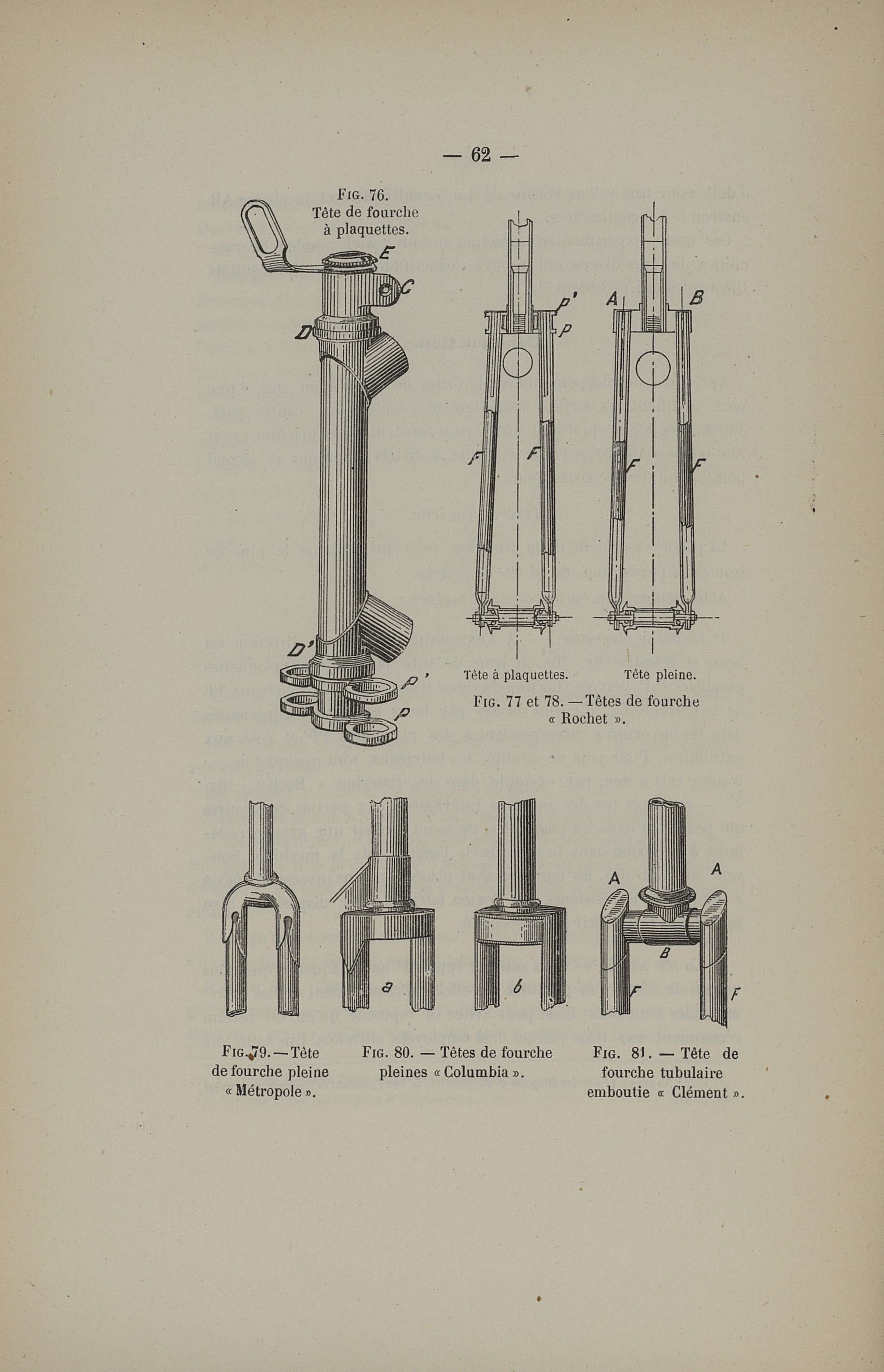 Fig. 76. Tête de fourche à plaquettes / Fig. 77 et 78. Têtes de fourche "Rochet" / Fig. 79. Tête de fourche pleine "Métropole" / Fig. 80. Têtes de fourche pleines "Columbia" / Fig. 81. Tête de fourche tubulaire emboutie "Clément" - La bicyclette. Sa construction et sa forme