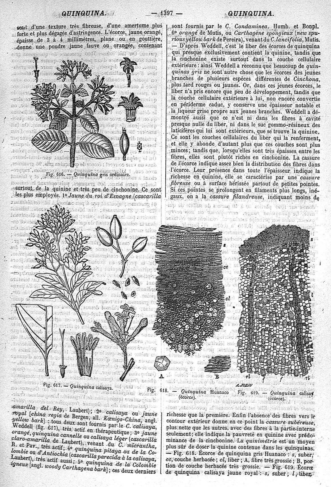 Fig. 616. Quinquina gris ordinaire / Fig. 617. Quinquina calisaya / Fig. 618. Quinquina Huanaco (écorce) / Fig. 619. Quinquina calisaya (écorce) - Dictionnaire de médecine, chirurgie... ; 21è éd. par A. Gilbert