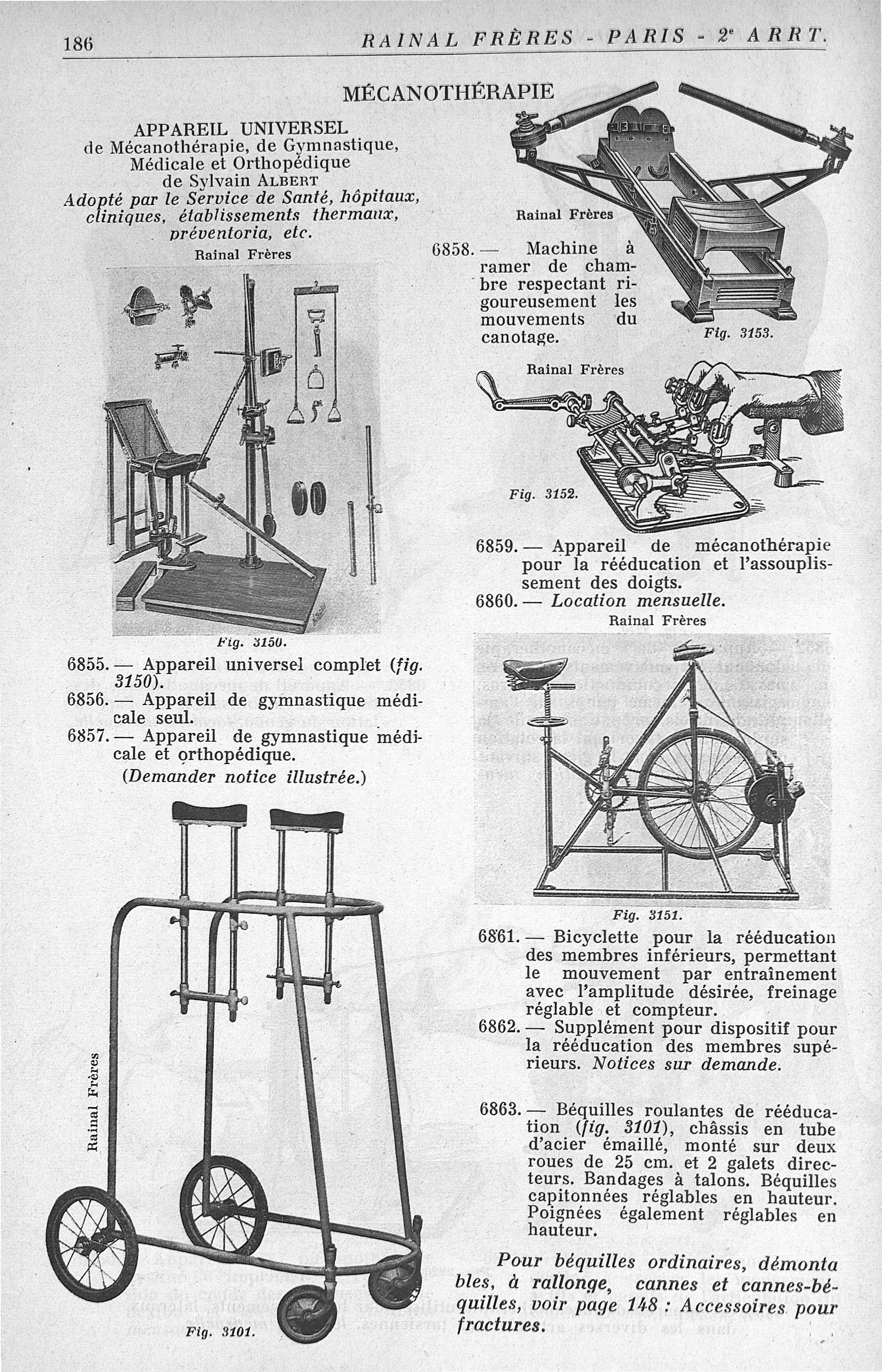 Fig. 3150. Appareil universel complet / Fig. 3153. Machine à ramer de chambre respectant rigoureusement les mouvements du canotage / Fig. 3152. Appareil de mécanothérapie pour la rééducation et l'assouplissement des doigts / Fig. 3101. Béquilles roulantes de rééducation / Fig. 3151. Bicyclette pour la rééducation des membres inférieurs - Catalogue général, 1825-1934