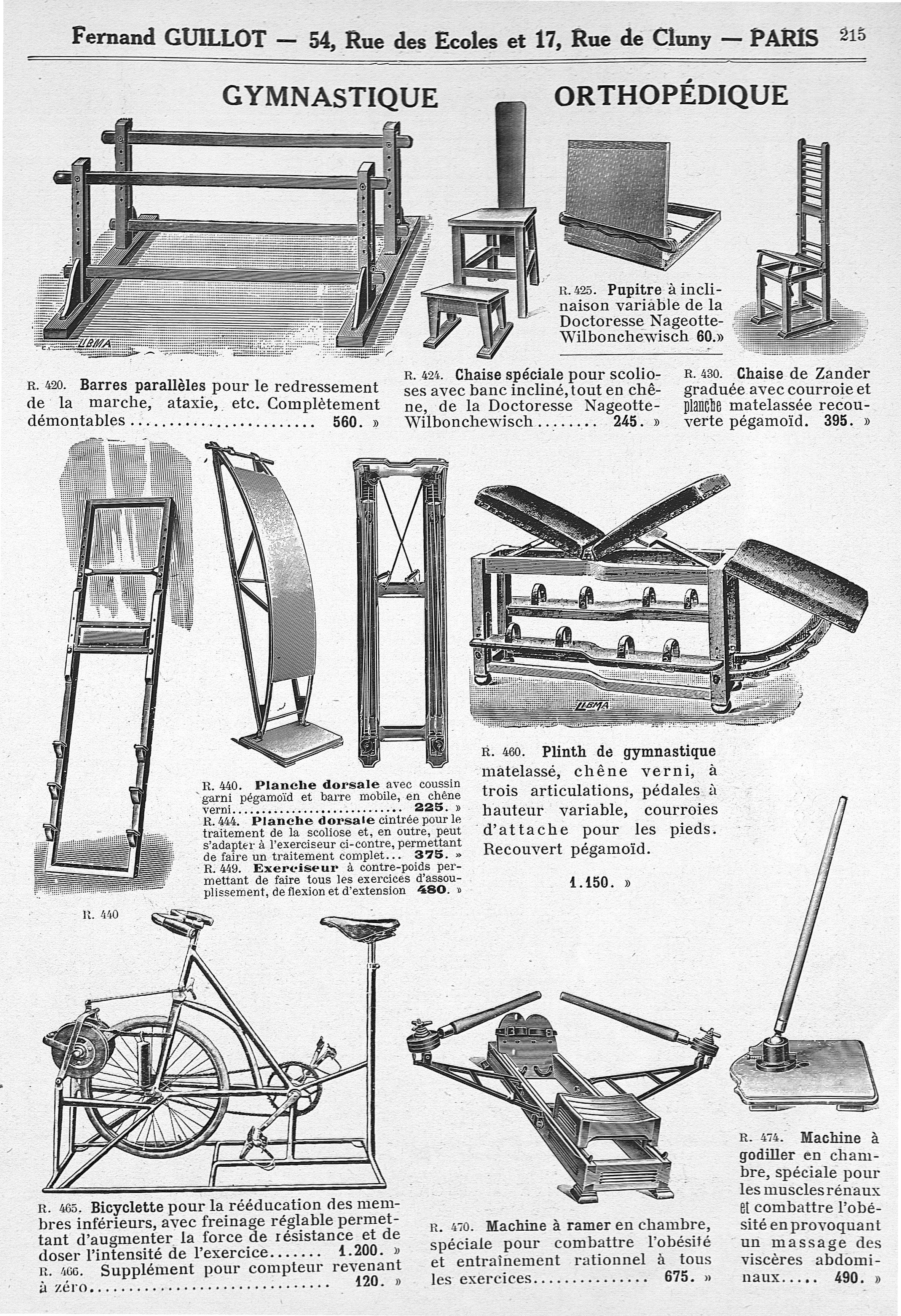Barres parallèles pour le redressement de la marche, ataxie, etc. Complètement démontables. Chaise spéciale pour scolioses avec banc incliné, tout en chêne, de la doctoresse Nageotte-Wilbonchewisch. Pupitre à inclinaison variable de la doctoresse Nageotte-Wilbonchewisch. Chaise de Zander graduée avec courroie et planche matelassée recouverte pégamoïd. Planche dorsale avec coussin garni pégamoïd et barre mobile, en chêne verni. Planche dorsale cintrée pour le traitement de la scoliose et, en outre, peut s'adapter à l'exerciseur ci-contre, permettant de faire un traitement complet. Exerciseur à contre-poids permettant de faire tous les exercices d'assouplissement, de flexion et d'extension. Plinth de gymnastique matelassé, chêne verni, à trois articulations, pédales à hauteur variable, courroies d'attache pour les pieds. Recouvert pégamoïd. Bicyclette pour la rééducation des membres inférieurs, avec freinage réglable permettant d'augmenter la force de résistance et de doser l'intensité de l'exercice. Supplément pour compteur revenant à zéro. Machine à ramer en chambre, spéciale pour combattre l'obésité et entraînement rationnel à tous les exercices. Machine à godiller en chambre, spéciale pour les muscles rénaux et combattre l'obésité en provoquant un massage des viscères abdominaux - Catalogue illustré d'instruments de chirurgie, d'appareils de médecine et d'orthopédie