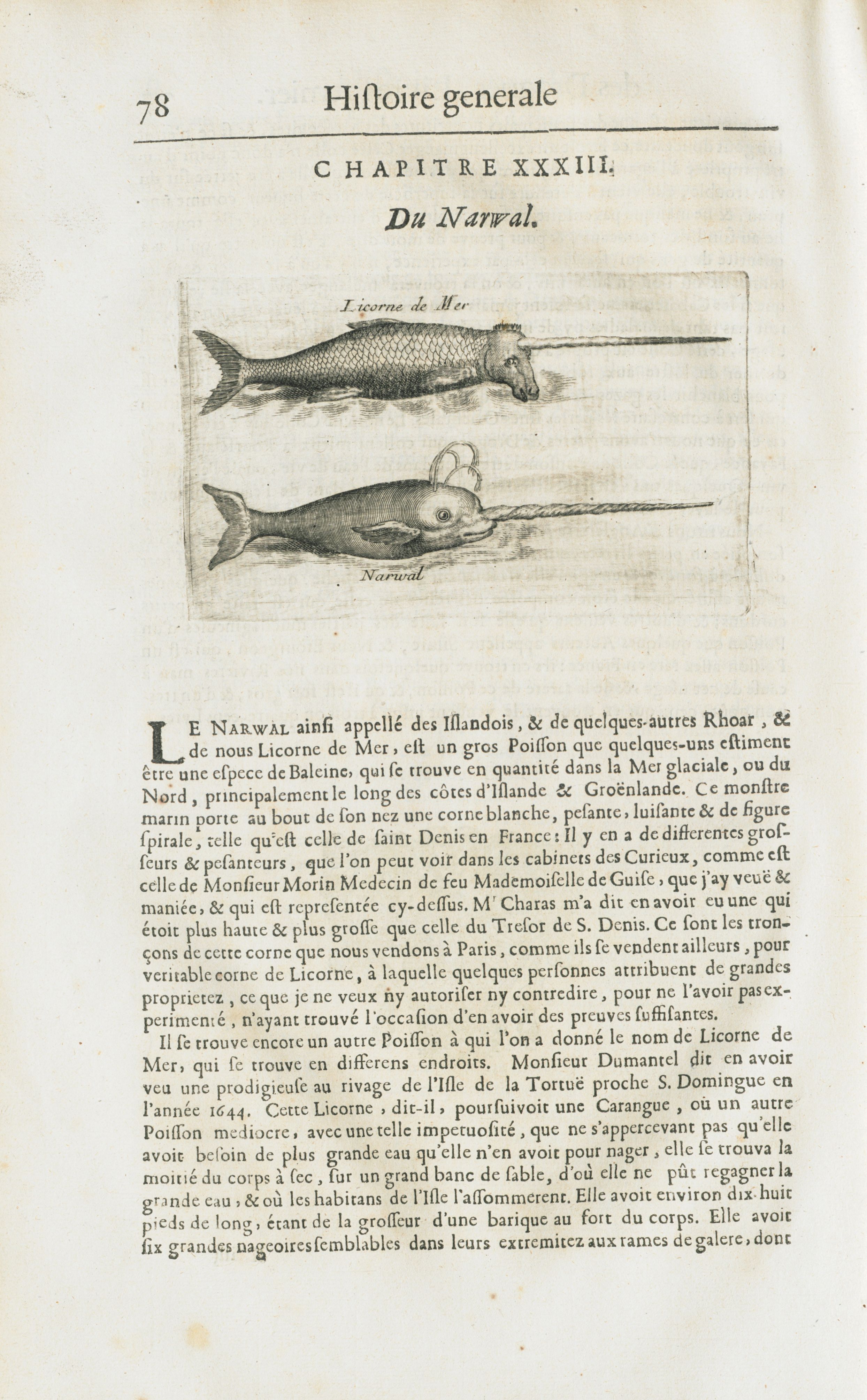 Licorne de mer / Narwal - Histoire générale des drogues, traitant des plantes, des animaux, & des mineraux ; ouvrage enrichy de plus de quatre cent figures en taille-douce tirées d'aprés nature ; avec un discours qui explique leurs differens noms, les pays d'où elles viennent, la maniere de connoître les veritables d'avec les falsifiées, & leurs proprietez, où l'on découvre l'erreur des anciens & des modernes...par le sieur Pierre Pomet....
