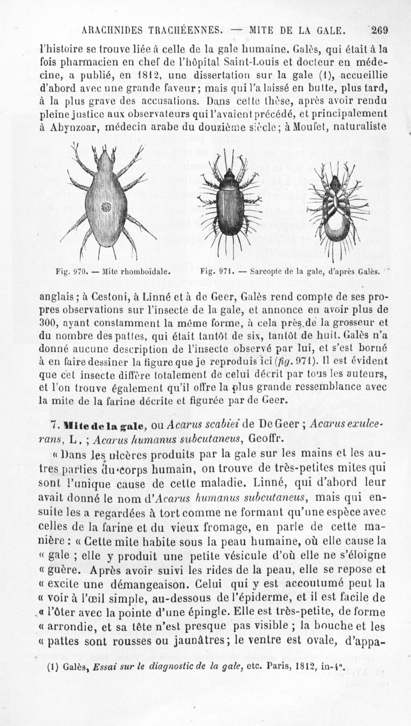 Mite rhomboïdale / Sarcopte de la gale, d'après Galès - Histoire naturelle des drogues simples, ou Cours d'histoire naturelle professé à l'École supérieure de pharmacie de Paris. Tome quatrième