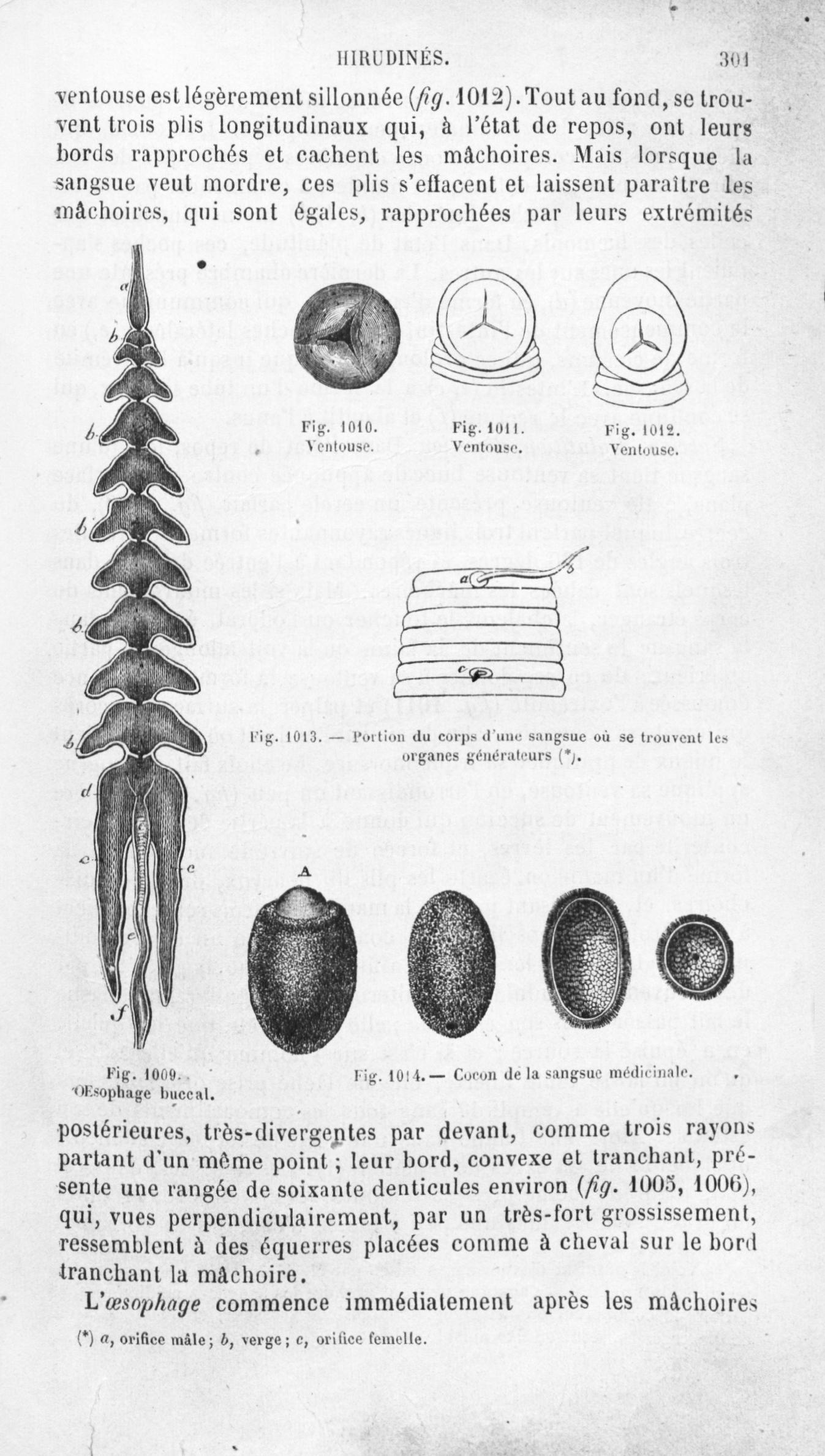 Oesophage buccal / Ventouse / Portion du corps d'une sangsue où se trouvent les organes générateurs / Cocon de la sangsue médicinale - Histoire naturelle des drogues simples, ou Cours d'histoire naturelle professé à l'École supérieure de pharmacie de Paris. Tome quatrième