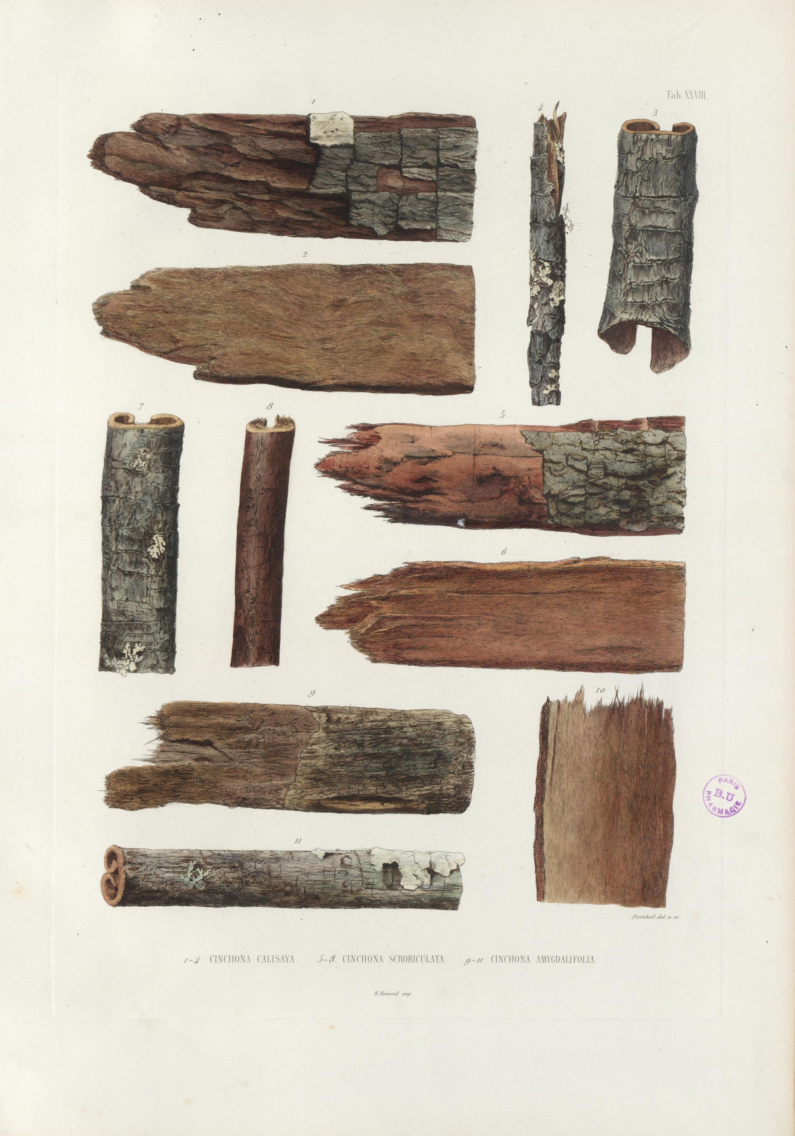 1-4. Cinchona calisaya. 5-8. Cinchona scrobiculata. 9-11. Cinchona amygdalifolia - Histoire naturelle des quinquinas ou Monographie du genre Cinchona, suivie d'une description du genre Cascarilla et de quelques autres plantes de la même tribu