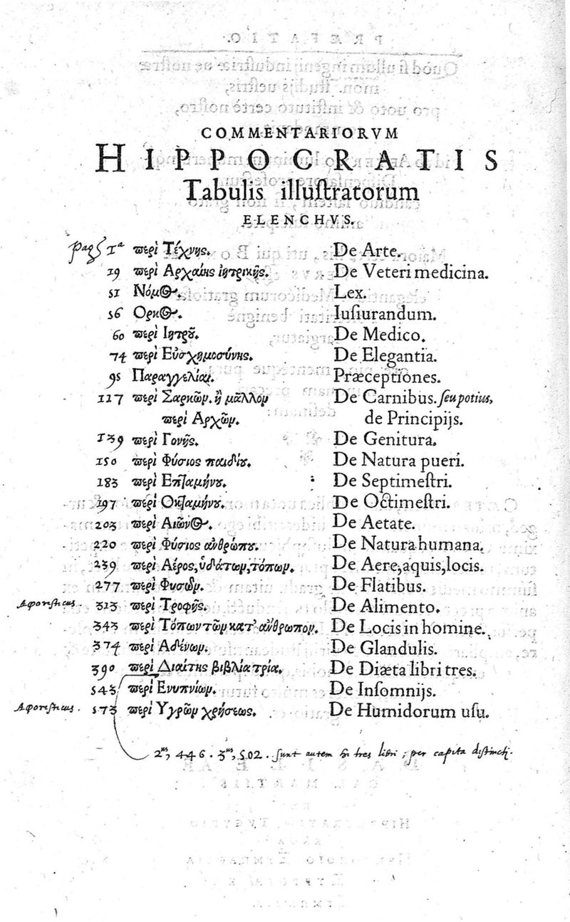 Hippocratis,... Viginti duo commentarii tabulis illustrati : graecus contextus ex doctiss. VV. codicibus emendatus ; latina versio Jani Cornarii... correcta ; sententiae insignes per locos communes... digestae, Theod. Zvingeri,... studio et conatu