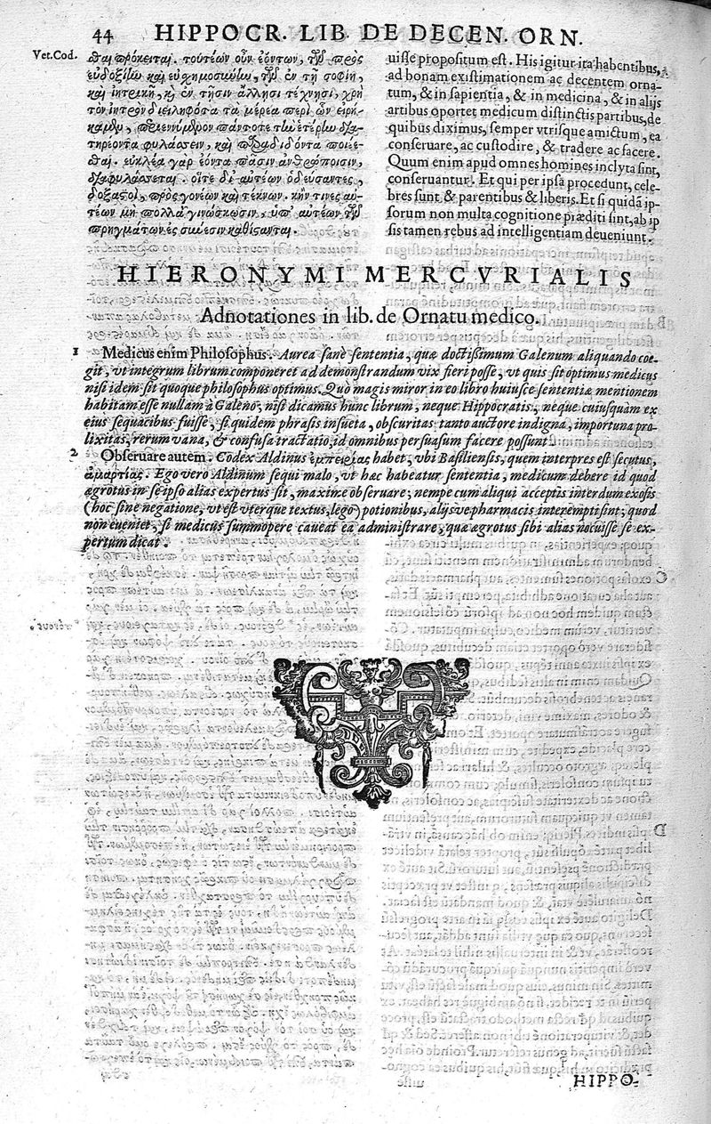 Hippocratis Coi opera quae extant : Graece et Latine veterum codicum collatione restituta : novo ordine in quattuor classes digesta / interpretationis latinae emendatione, & scholijs illustrata, a Hieron. Mercuriali ...