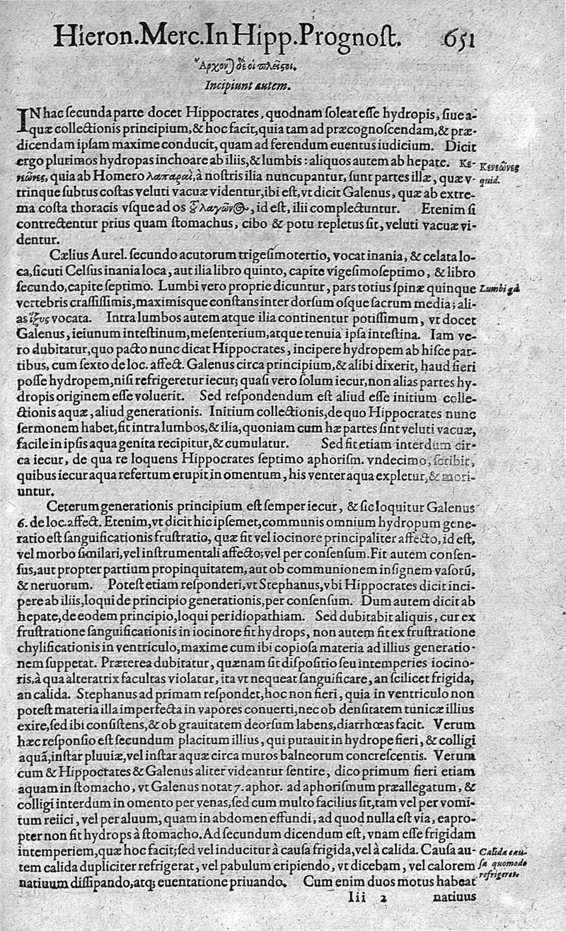 Hieronymi Mercurialis,... Commentarii eruditissimi in Hippocratis,... Prognostica, Prorrhetica, de Victus ratione in morbis acutis et Epidemicas historias [cum versione eorum latina], quibus accessere tractatus luculentissimi de hominis generatione, vino et aqua balneisque pisanis, a Marco Cornacchino,... nunc primum in lucem editi...