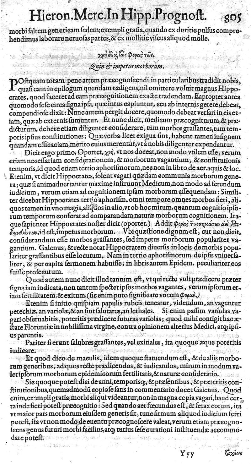 Hieronymi Mercurialis,... Commentarii eruditissimi in Hippocratis,... Prognostica, Prorrhetica, de Victus ratione in morbis acutis et Epidemicas historias [cum versione eorum latina], quibus accessere tractatus luculentissimi de hominis generatione, vino et aqua balneisque pisanis, a Marco Cornacchino,... nunc primum in lucem editi...