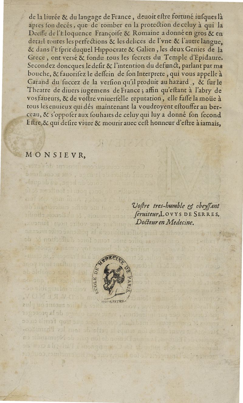 les Oeuvres pharmaceutiques augmentées d'un tiers en cette seconde édition par l'auteur, puis traduittes, embellies de plusieurs figures necessaires à la cognoissance de la médecine & pharmacie & mises en lumière par Louys de Serres