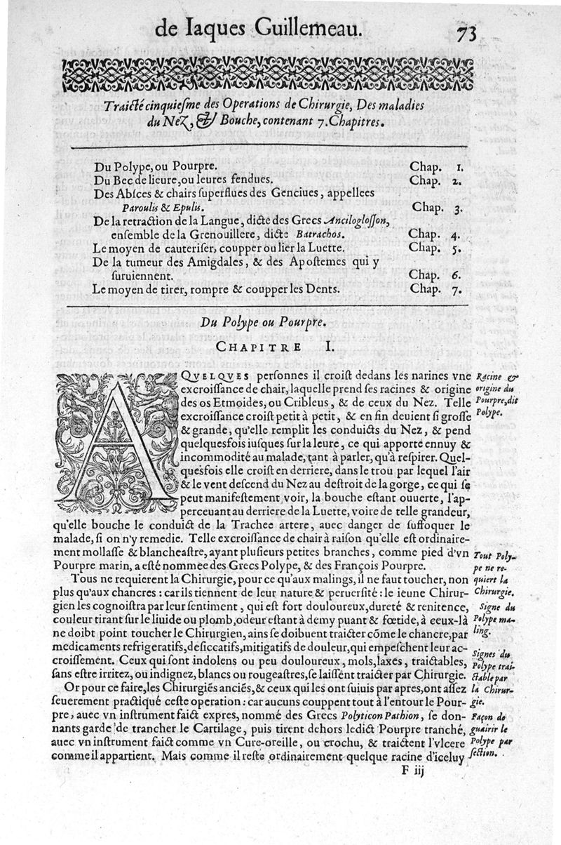 La chirurgie françoise, recueillie des Anciens Medecins et Chirurgiens avec plusieurs figures des Instrumens necesseres pour l’operation Manuelle par Jacques Guillemeau D’Orleans, Chirurgien du Roy et Juré a Paris