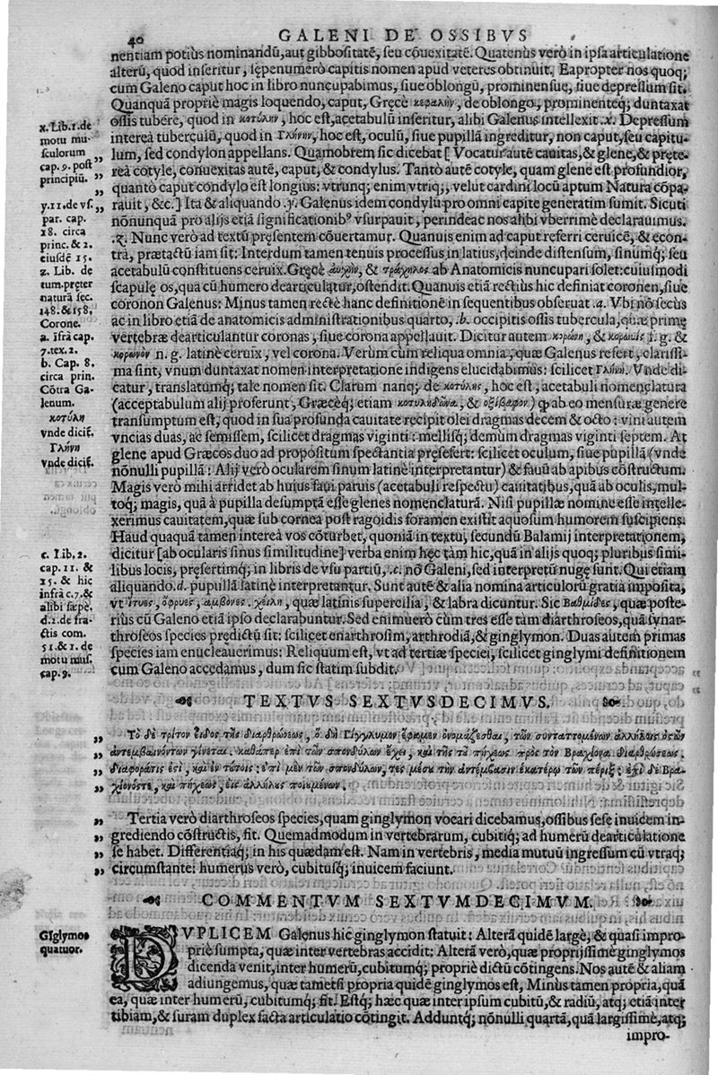 Joan. Philippi Ingrassiae,... In Galeni librum de Ossibus... commentaria, nunc primum sedulo in lucem edita... quibus appositus est graecus Galeni contextus, una cum nova et fideli ejusdem Ingrassiae in latinum versione
