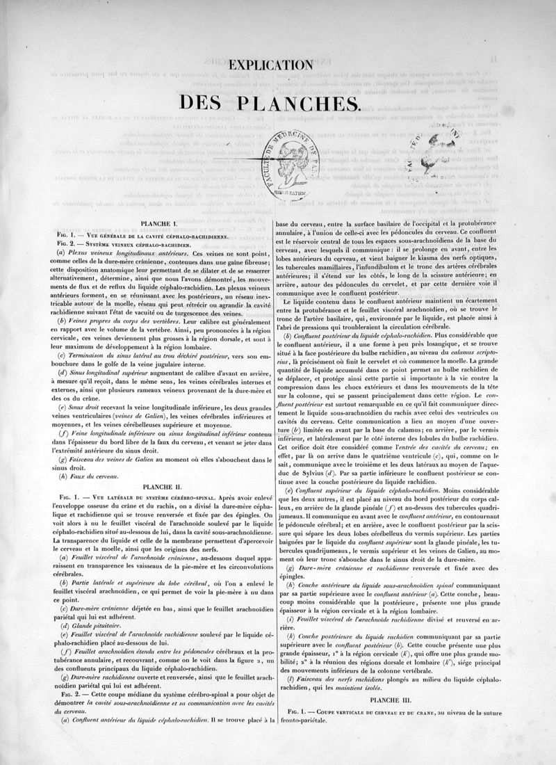 Recherches physiologiques et cliniques sur le liquide céphalo-rachidien ou cérébro-spinal :explication des planches
