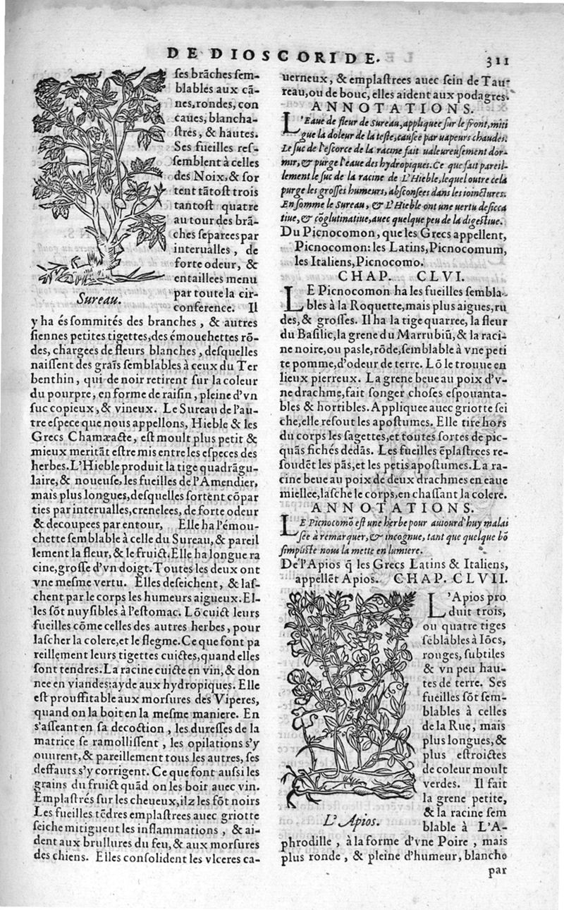 Les six livres de Pedarion Dioscoride d’Anazarbe de la matiere medicale, translatez de Latin en François. A chacun Chapitre sont adjoustees certaines annotations fort doctes, et recueillies des plus excellens Medecins, anciens et modernes
