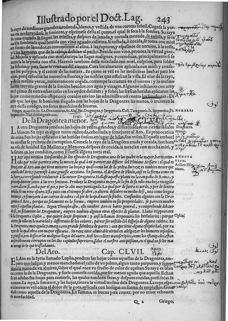 Pedacio Dioscorides Anazarbeo, acerca de la materia medicinal, y de los venenos mortiferos, traduzido de lengua griega en la vulgar castellana illustrado y con claras y substantiales annotationes, y con las figuras de innumeras plantas exquisitas y raras por el doctor Andres de Laguna, Medico de Julio III, Pont. Maxi.