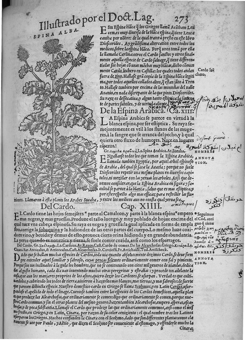 Pedacio Dioscorides Anazarbeo, acerca de la materia medicinal, y de los venenos mortiferos, traduzido de lengua griega en la vulgar castellana illustrado y con claras y substantiales annotationes, y con las figuras de innumeras plantas exquisitas y raras por el doctor Andres de Laguna, Medico de Julio III, Pont. Maxi.