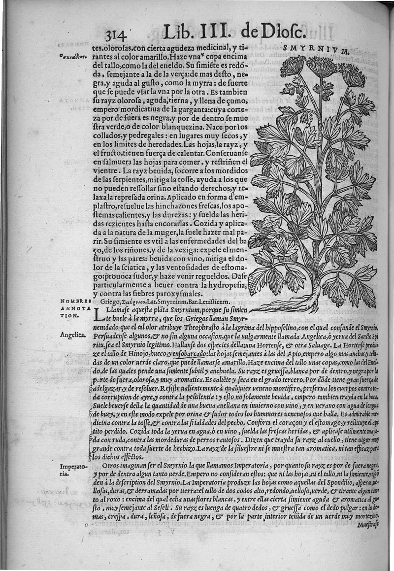 Pedacio Dioscorides Anazarbeo, acerca de la materia medicinal, y de los venenos mortiferos, traduzido de lengua griega en la vulgar castellana illustrado y con claras y substantiales annotationes, y con las figuras de innumeras plantas exquisitas y raras por el doctor Andres de Laguna, Medico de Julio III, Pont. Maxi.