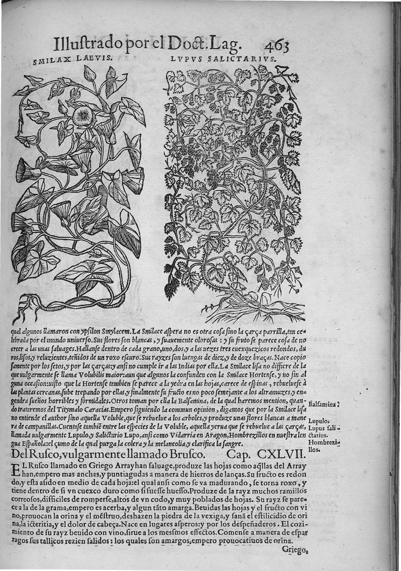Pedacio Dioscorides Anazarbeo, acerca de la materia medicinal, y de los venenos mortiferos, traduzido de lengua griega en la vulgar castellana illustrado y con claras y substantiales annotationes, y con las figuras de innumeras plantas exquisitas y raras por el doctor Andres de Laguna, Medico de Julio III, Pont. Maxi.
