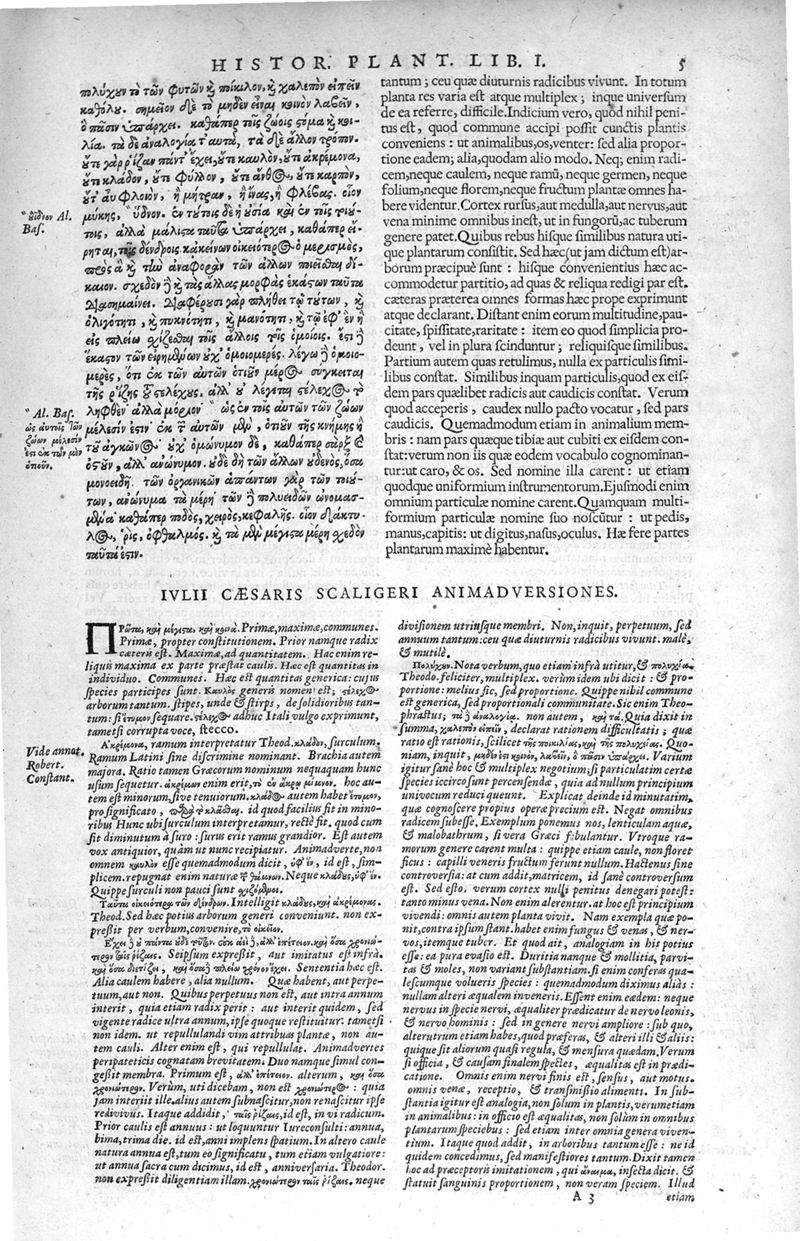 Theophrasti Eresii de Historia plantarum libri decem graece et latine. In quibus textum graecum..., latinam Gazae versionem... rariorum plantarum iconibus illustravit Joannes Bodaeus a Stapel,... Accesserunt Julii Caesaris Scaligeri in eosdem libros animadversiones, et Roberti Constantini annotationes...