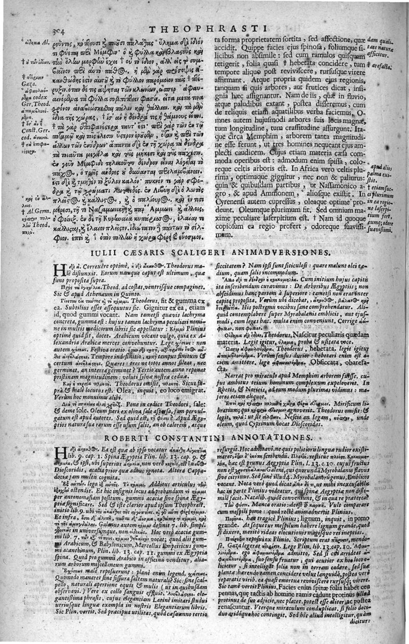 Theophrasti Eresii de Historia plantarum libri decem graece et latine. In quibus textum graecum..., latinam Gazae versionem... rariorum plantarum iconibus illustravit Joannes Bodaeus a Stapel,... Accesserunt Julii Caesaris Scaligeri in eosdem libros animadversiones, et Roberti Constantini annotationes...