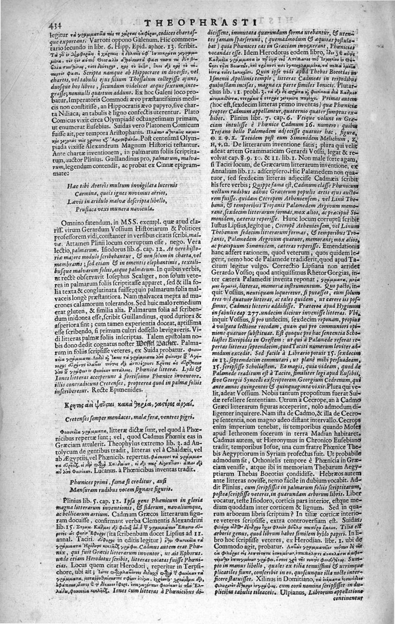 Theophrasti Eresii de Historia plantarum libri decem graece et latine. In quibus textum graecum..., latinam Gazae versionem... rariorum plantarum iconibus illustravit Joannes Bodaeus a Stapel,... Accesserunt Julii Caesaris Scaligeri in eosdem libros animadversiones, et Roberti Constantini annotationes...