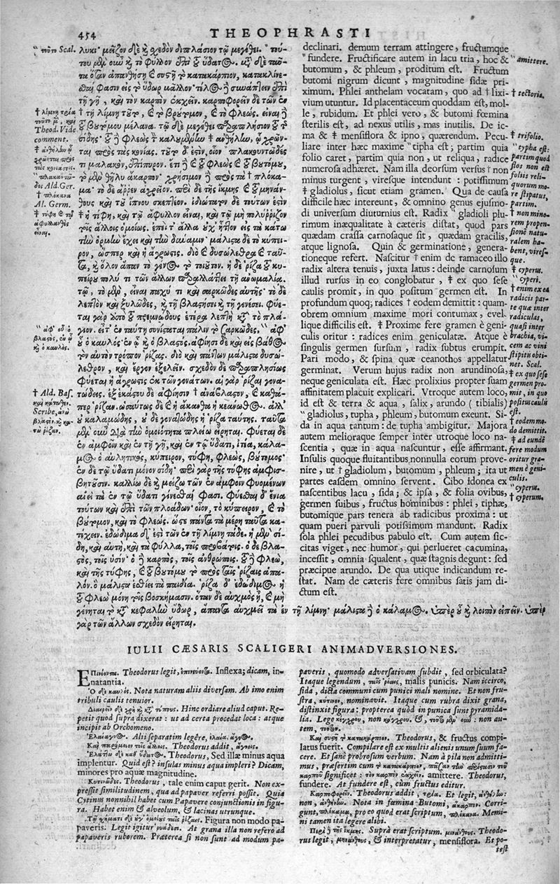 Theophrasti Eresii de Historia plantarum libri decem graece et latine. In quibus textum graecum..., latinam Gazae versionem... rariorum plantarum iconibus illustravit Joannes Bodaeus a Stapel,... Accesserunt Julii Caesaris Scaligeri in eosdem libros animadversiones, et Roberti Constantini annotationes...
