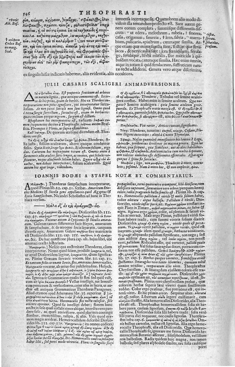 Theophrasti Eresii de Historia plantarum libri decem graece et latine. In quibus textum graecum..., latinam Gazae versionem... rariorum plantarum iconibus illustravit Joannes Bodaeus a Stapel,... Accesserunt Julii Caesaris Scaligeri in eosdem libros animadversiones, et Roberti Constantini annotationes...