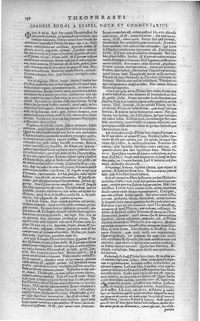 Theophrasti Eresii de Historia plantarum libri decem graece et latine. In quibus textum graecum..., latinam Gazae versionem... rariorum plantarum iconibus illustravit Joannes Bodaeus a Stapel,... Accesserunt Julii Caesaris Scaligeri in eosdem libros animadversiones, et Roberti Constantini annotationes...