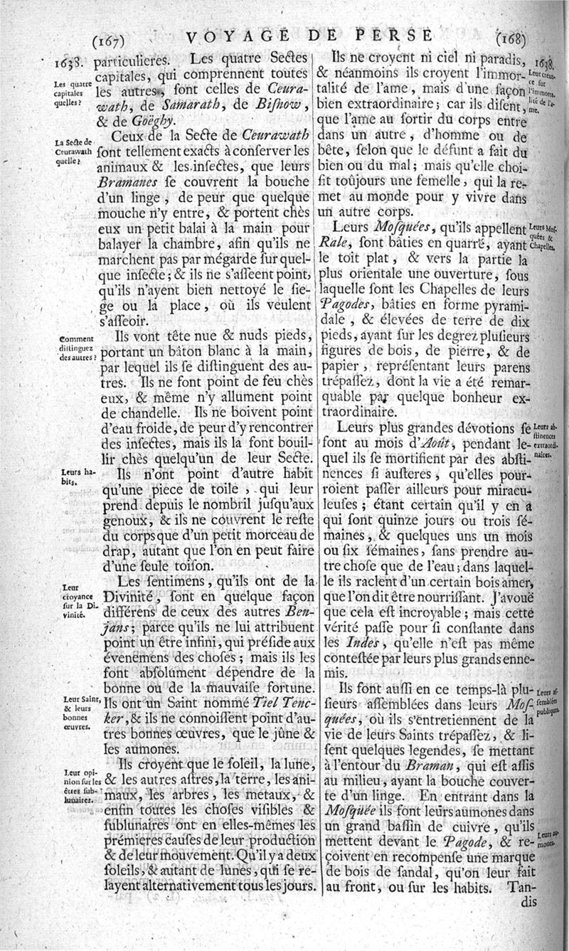 Voyages celebres & remarquables, faits de Perse aux Indes Orientales, par le sr. Jean-Albert de Mandelslo, gentilhomme des ambassadeurs du duc de Holstein en Moscovie & Perse. Contenant une description nouvelle & très-curieuse de l'Indostan, de l'empire du Grand-Mogol, des îles & presqu'îles de l'Orient, des royaumes de Siam, du Japon, de la Chine, du Congo, &c. Où l'on trouve la situation exacte de tous ces pays & etats ; & où l'on rapporte assez au long le naturel, les moeurs, & les coutumes de leurs habitans; leur gouvernement politique & ecclesiastique; les raretez qui se rencontrent dans ces pays; & les ceremonies qu'on y observe. Mis en ordre & publiez, après la mort de l'illustre voyageur, par le sr. Adam Olearius... Traduits de l'original par le sr. A. De Wicquefort ... Divisez en deux parties. Nouvelle edition revûe & corrigée exactement, augmentée considerablement, tant dans le corps de l'ouvrage qu'aux marginales, & surpassant en bonté & en beauté les précedentes editions. On y a encore ajouté des cartes géographiques, des représentations des villes, & autres taille-douces très-belles & très-exactes. On y trouve à la fin une Table fort ample & fort exacte. Tome premier [-second].