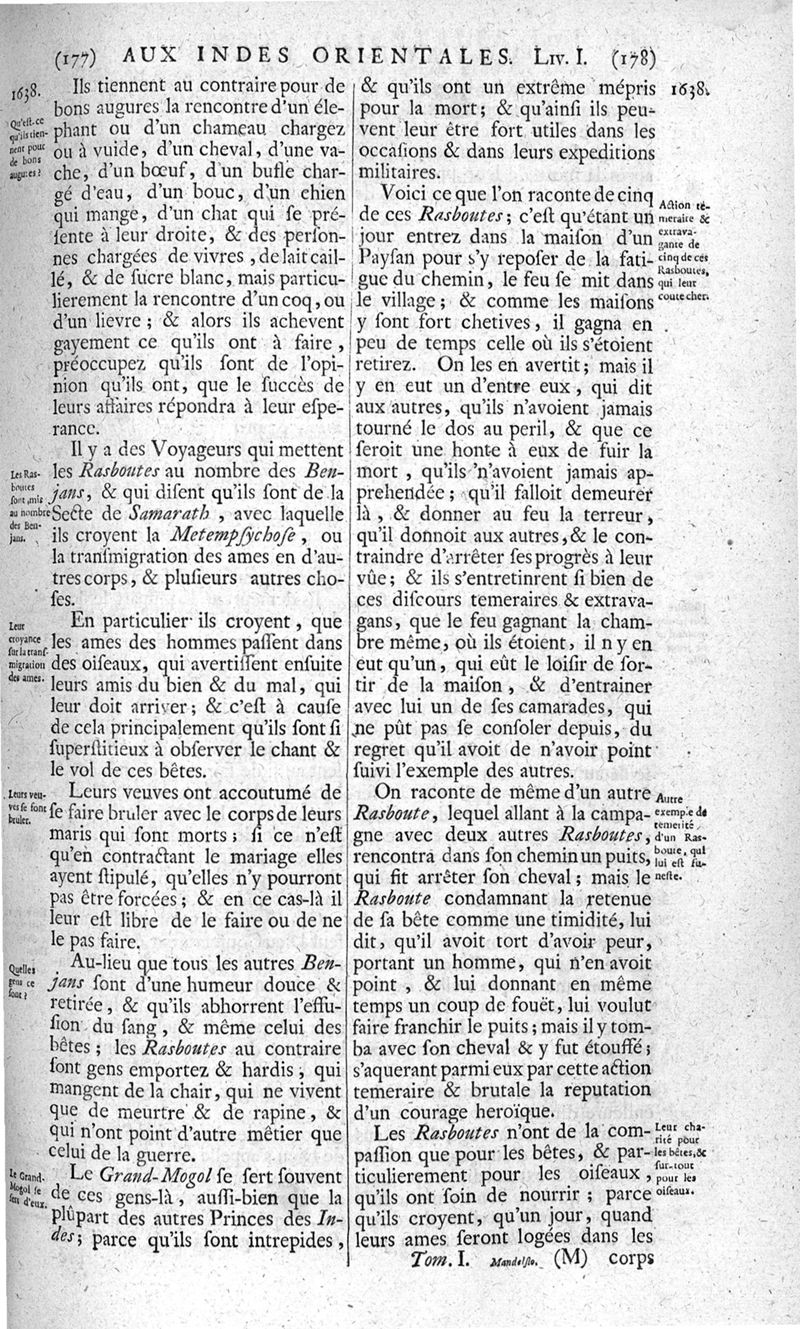 Voyages celebres & remarquables, faits de Perse aux Indes Orientales, par le sr. Jean-Albert de Mandelslo, gentilhomme des ambassadeurs du duc de Holstein en Moscovie & Perse. Contenant une description nouvelle & très-curieuse de l'Indostan, de l'empire du Grand-Mogol, des îles & presqu'îles de l'Orient, des royaumes de Siam, du Japon, de la Chine, du Congo, &c. Où l'on trouve la situation exacte de tous ces pays & etats ; & où l'on rapporte assez au long le naturel, les moeurs, & les coutumes de leurs habitans; leur gouvernement politique & ecclesiastique; les raretez qui se rencontrent dans ces pays; & les ceremonies qu'on y observe. Mis en ordre & publiez, après la mort de l'illustre voyageur, par le sr. Adam Olearius... Traduits de l'original par le sr. A. De Wicquefort ... Divisez en deux parties. Nouvelle edition revûe & corrigée exactement, augmentée considerablement, tant dans le corps de l'ouvrage qu'aux marginales, & surpassant en bonté & en beauté les précedentes editions. On y a encore ajouté des cartes géographiques, des représentations des villes, & autres taille-douces très-belles & très-exactes. On y trouve à la fin une Table fort ample & fort exacte. Tome premier [-second].