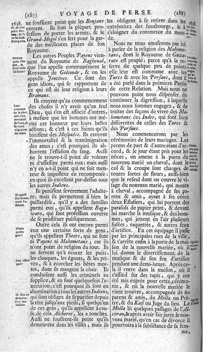 Voyages celebres & remarquables, faits de Perse aux Indes Orientales, par le sr. Jean-Albert de Mandelslo, gentilhomme des ambassadeurs du duc de Holstein en Moscovie & Perse. Contenant une description nouvelle & très-curieuse de l'Indostan, de l'empire du Grand-Mogol, des îles & presqu'îles de l'Orient, des royaumes de Siam, du Japon, de la Chine, du Congo, &c. Où l'on trouve la situation exacte de tous ces pays & etats ; & où l'on rapporte assez au long le naturel, les moeurs, & les coutumes de leurs habitans; leur gouvernement politique & ecclesiastique; les raretez qui se rencontrent dans ces pays; & les ceremonies qu'on y observe. Mis en ordre & publiez, après la mort de l'illustre voyageur, par le sr. Adam Olearius... Traduits de l'original par le sr. A. De Wicquefort ... Divisez en deux parties. Nouvelle edition revûe & corrigée exactement, augmentée considerablement, tant dans le corps de l'ouvrage qu'aux marginales, & surpassant en bonté & en beauté les précedentes editions. On y a encore ajouté des cartes géographiques, des représentations des villes, & autres taille-douces très-belles & très-exactes. On y trouve à la fin une Table fort ample & fort exacte. Tome premier [-second].