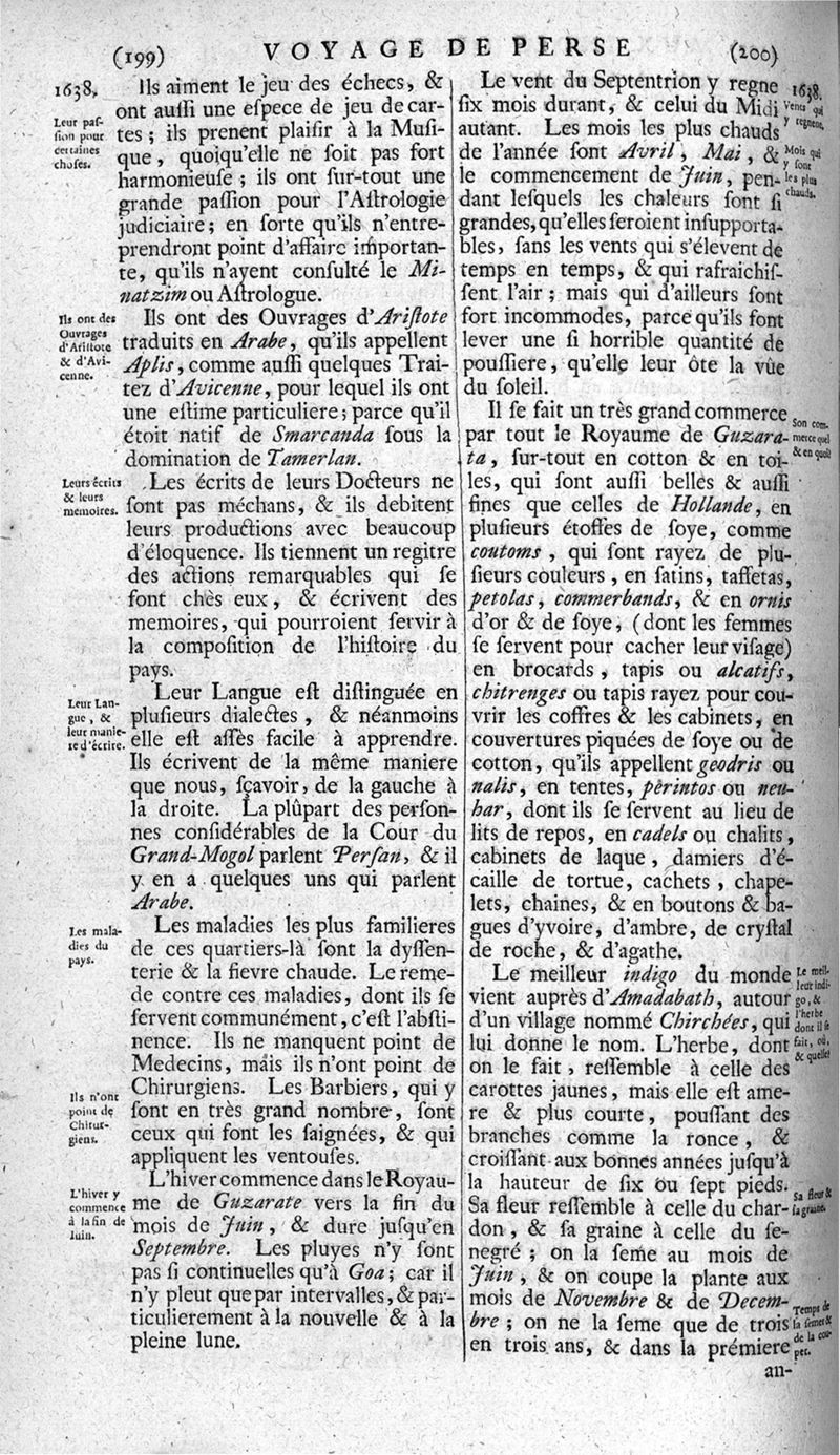 Voyages celebres & remarquables, faits de Perse aux Indes Orientales, par le sr. Jean-Albert de Mandelslo, gentilhomme des ambassadeurs du duc de Holstein en Moscovie & Perse. Contenant une description nouvelle & très-curieuse de l'Indostan, de l'empire du Grand-Mogol, des îles & presqu'îles de l'Orient, des royaumes de Siam, du Japon, de la Chine, du Congo, &c. Où l'on trouve la situation exacte de tous ces pays & etats ; & où l'on rapporte assez au long le naturel, les moeurs, & les coutumes de leurs habitans; leur gouvernement politique & ecclesiastique; les raretez qui se rencontrent dans ces pays; & les ceremonies qu'on y observe. Mis en ordre & publiez, après la mort de l'illustre voyageur, par le sr. Adam Olearius... Traduits de l'original par le sr. A. De Wicquefort ... Divisez en deux parties. Nouvelle edition revûe & corrigée exactement, augmentée considerablement, tant dans le corps de l'ouvrage qu'aux marginales, & surpassant en bonté & en beauté les précedentes editions. On y a encore ajouté des cartes géographiques, des représentations des villes, & autres taille-douces très-belles & très-exactes. On y trouve à la fin une Table fort ample & fort exacte. Tome premier [-second].