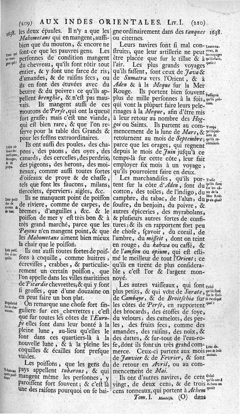 Voyages celebres & remarquables, faits de Perse aux Indes Orientales, par le sr. Jean-Albert de Mandelslo, gentilhomme des ambassadeurs du duc de Holstein en Moscovie & Perse. Contenant une description nouvelle & très-curieuse de l'Indostan, de l'empire du Grand-Mogol, des îles & presqu'îles de l'Orient, des royaumes de Siam, du Japon, de la Chine, du Congo, &c. Où l'on trouve la situation exacte de tous ces pays & etats ; & où l'on rapporte assez au long le naturel, les moeurs, & les coutumes de leurs habitans; leur gouvernement politique & ecclesiastique; les raretez qui se rencontrent dans ces pays; & les ceremonies qu'on y observe. Mis en ordre & publiez, après la mort de l'illustre voyageur, par le sr. Adam Olearius... Traduits de l'original par le sr. A. De Wicquefort ... Divisez en deux parties. Nouvelle edition revûe & corrigée exactement, augmentée considerablement, tant dans le corps de l'ouvrage qu'aux marginales, & surpassant en bonté & en beauté les précedentes editions. On y a encore ajouté des cartes géographiques, des représentations des villes, & autres taille-douces très-belles & très-exactes. On y trouve à la fin une Table fort ample & fort exacte. Tome premier [-second].