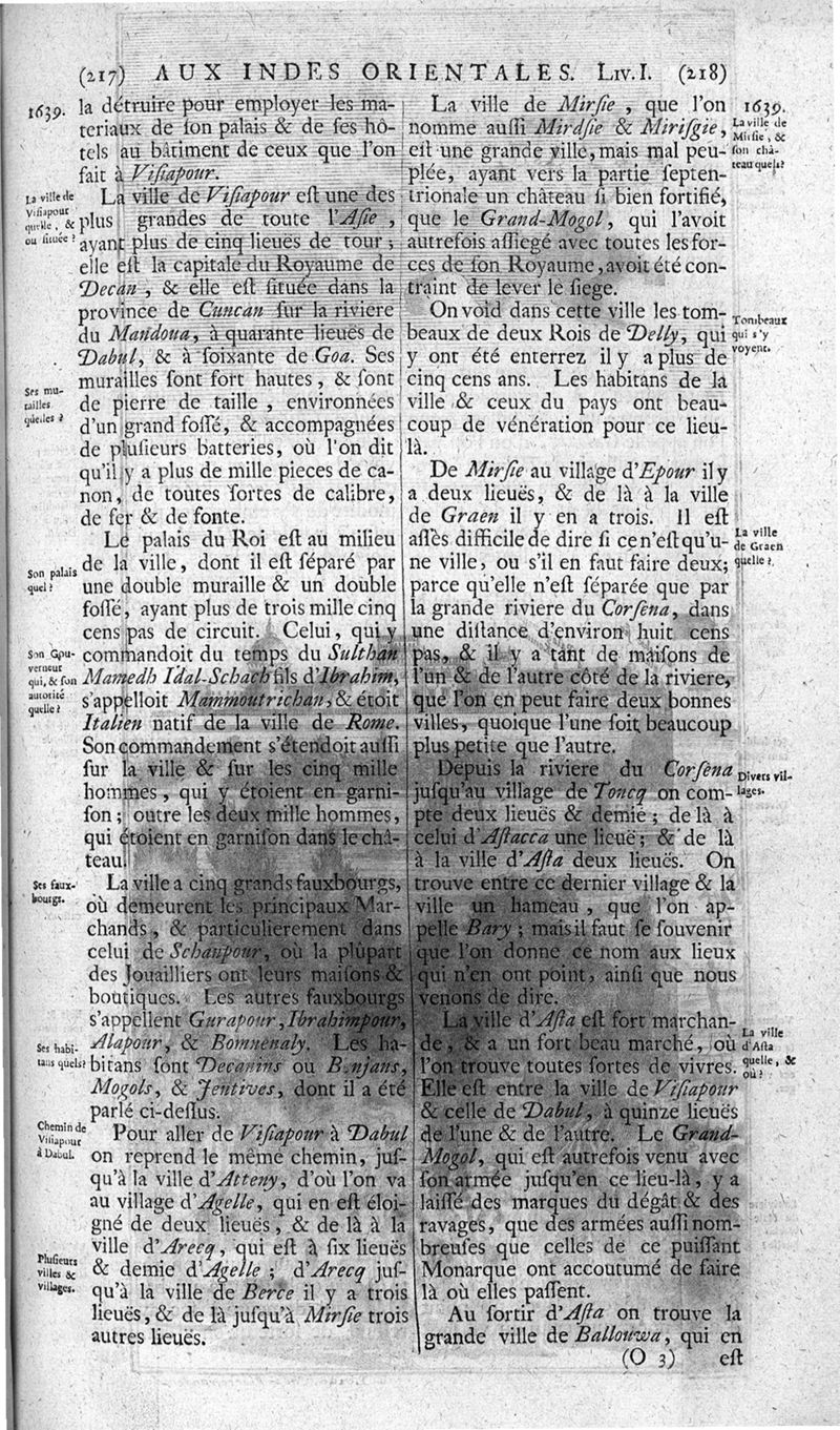 Voyages celebres & remarquables, faits de Perse aux Indes Orientales, par le sr. Jean-Albert de Mandelslo, gentilhomme des ambassadeurs du duc de Holstein en Moscovie & Perse. Contenant une description nouvelle & très-curieuse de l'Indostan, de l'empire du Grand-Mogol, des îles & presqu'îles de l'Orient, des royaumes de Siam, du Japon, de la Chine, du Congo, &c. Où l'on trouve la situation exacte de tous ces pays & etats ; & où l'on rapporte assez au long le naturel, les moeurs, & les coutumes de leurs habitans; leur gouvernement politique & ecclesiastique; les raretez qui se rencontrent dans ces pays; & les ceremonies qu'on y observe. Mis en ordre & publiez, après la mort de l'illustre voyageur, par le sr. Adam Olearius... Traduits de l'original par le sr. A. De Wicquefort ... Divisez en deux parties. Nouvelle edition revûe & corrigée exactement, augmentée considerablement, tant dans le corps de l'ouvrage qu'aux marginales, & surpassant en bonté & en beauté les précedentes editions. On y a encore ajouté des cartes géographiques, des représentations des villes, & autres taille-douces très-belles & très-exactes. On y trouve à la fin une Table fort ample & fort exacte. Tome premier [-second].