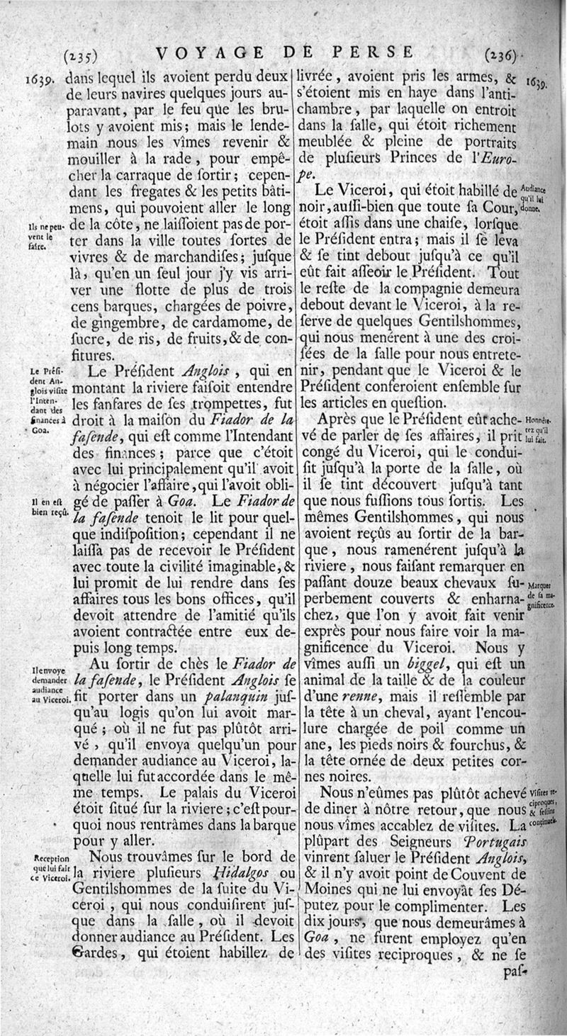 Voyages celebres & remarquables, faits de Perse aux Indes Orientales, par le sr. Jean-Albert de Mandelslo, gentilhomme des ambassadeurs du duc de Holstein en Moscovie & Perse. Contenant une description nouvelle & très-curieuse de l'Indostan, de l'empire du Grand-Mogol, des îles & presqu'îles de l'Orient, des royaumes de Siam, du Japon, de la Chine, du Congo, &c. Où l'on trouve la situation exacte de tous ces pays & etats ; & où l'on rapporte assez au long le naturel, les moeurs, & les coutumes de leurs habitans; leur gouvernement politique & ecclesiastique; les raretez qui se rencontrent dans ces pays; & les ceremonies qu'on y observe. Mis en ordre & publiez, après la mort de l'illustre voyageur, par le sr. Adam Olearius... Traduits de l'original par le sr. A. De Wicquefort ... Divisez en deux parties. Nouvelle edition revûe & corrigée exactement, augmentée considerablement, tant dans le corps de l'ouvrage qu'aux marginales, & surpassant en bonté & en beauté les précedentes editions. On y a encore ajouté des cartes géographiques, des représentations des villes, & autres taille-douces très-belles & très-exactes. On y trouve à la fin une Table fort ample & fort exacte. Tome premier [-second].