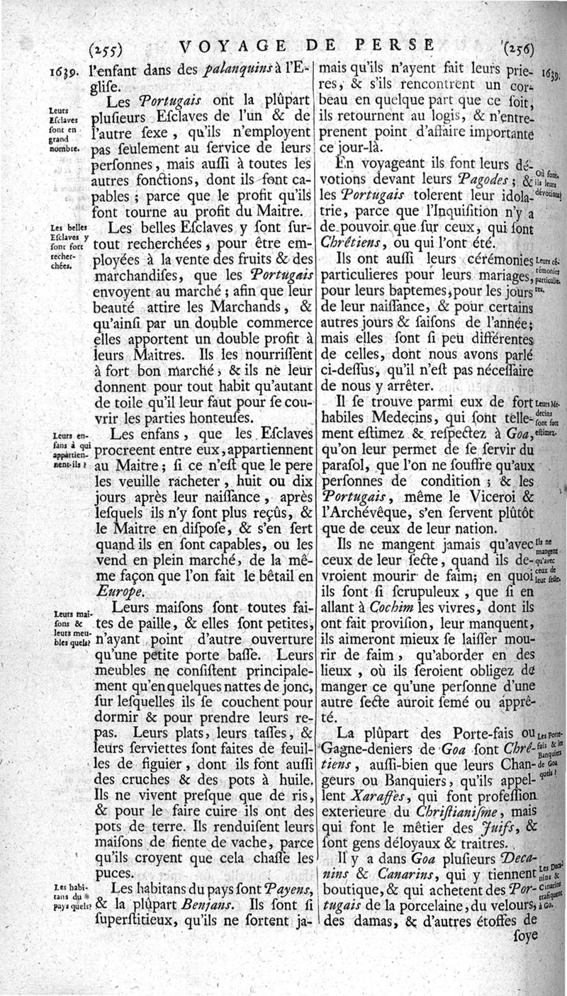 Voyages celebres & remarquables, faits de Perse aux Indes Orientales, par le sr. Jean-Albert de Mandelslo, gentilhomme des ambassadeurs du duc de Holstein en Moscovie & Perse. Contenant une description nouvelle & très-curieuse de l'Indostan, de l'empire du Grand-Mogol, des îles & presqu'îles de l'Orient, des royaumes de Siam, du Japon, de la Chine, du Congo, &c. Où l'on trouve la situation exacte de tous ces pays & etats ; & où l'on rapporte assez au long le naturel, les moeurs, & les coutumes de leurs habitans; leur gouvernement politique & ecclesiastique; les raretez qui se rencontrent dans ces pays; & les ceremonies qu'on y observe. Mis en ordre & publiez, après la mort de l'illustre voyageur, par le sr. Adam Olearius... Traduits de l'original par le sr. A. De Wicquefort ... Divisez en deux parties. Nouvelle edition revûe & corrigée exactement, augmentée considerablement, tant dans le corps de l'ouvrage qu'aux marginales, & surpassant en bonté & en beauté les précedentes editions. On y a encore ajouté des cartes géographiques, des représentations des villes, & autres taille-douces très-belles & très-exactes. On y trouve à la fin une Table fort ample & fort exacte. Tome premier [-second].