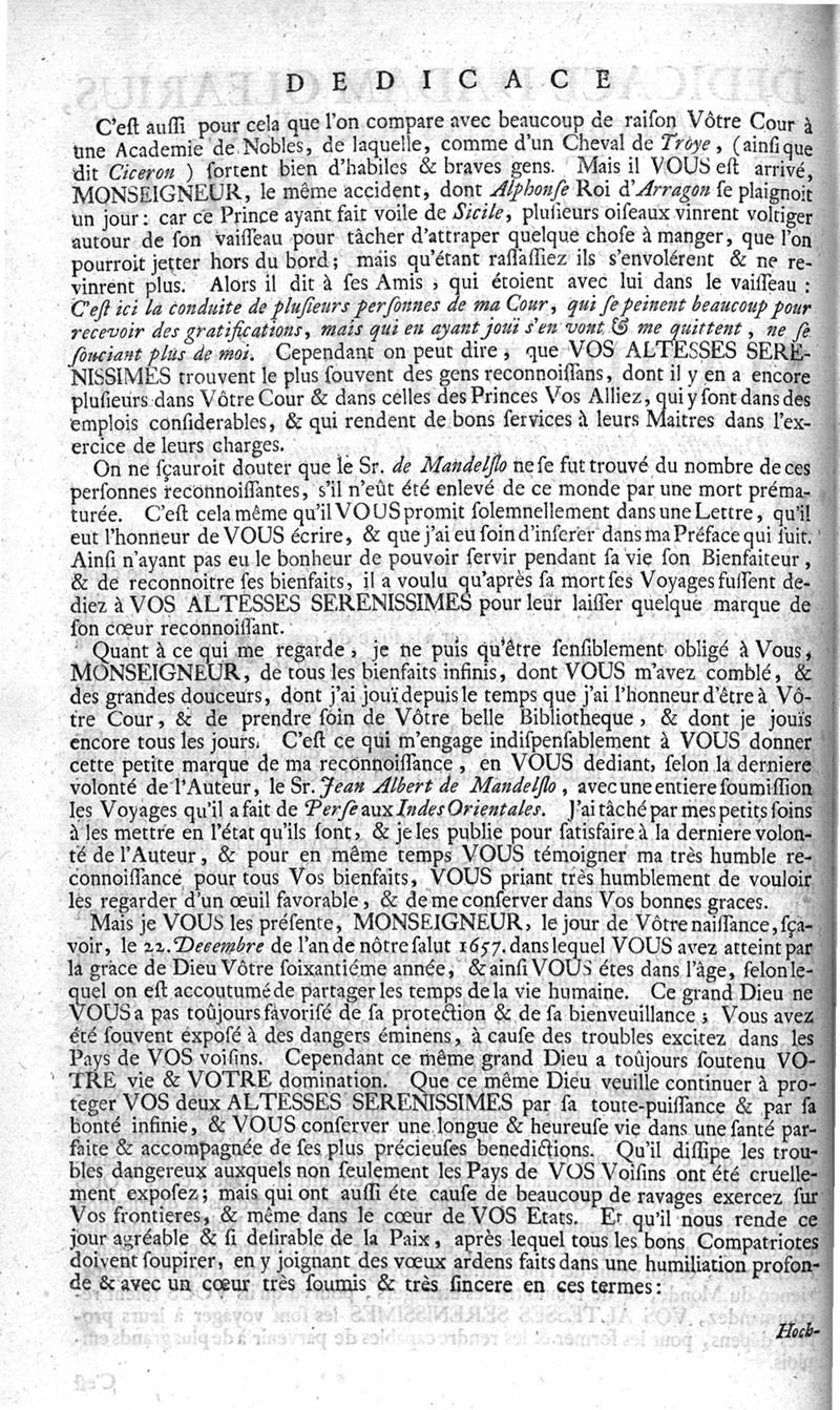 Voyages celebres & remarquables, faits de Perse aux Indes Orientales, par le sr. Jean-Albert de Mandelslo, gentilhomme des ambassadeurs du duc de Holstein en Moscovie & Perse. Contenant une description nouvelle & très-curieuse de l'Indostan, de l'empire du Grand-Mogol, des îles & presqu'îles de l'Orient, des royaumes de Siam, du Japon, de la Chine, du Congo, &c. Où l'on trouve la situation exacte de tous ces pays & etats ; & où l'on rapporte assez au long le naturel, les moeurs, & les coutumes de leurs habitans; leur gouvernement politique & ecclesiastique; les raretez qui se rencontrent dans ces pays; & les ceremonies qu'on y observe. Mis en ordre & publiez, après la mort de l'illustre voyageur, par le sr. Adam Olearius... Traduits de l'original par le sr. A. De Wicquefort ... Divisez en deux parties. Nouvelle edition revûe & corrigée exactement, augmentée considerablement, tant dans le corps de l'ouvrage qu'aux marginales, & surpassant en bonté & en beauté les précedentes editions. On y a encore ajouté des cartes géographiques, des représentations des villes, & autres taille-douces très-belles & très-exactes. On y trouve à la fin une Table fort ample & fort exacte. Tome premier [-second].