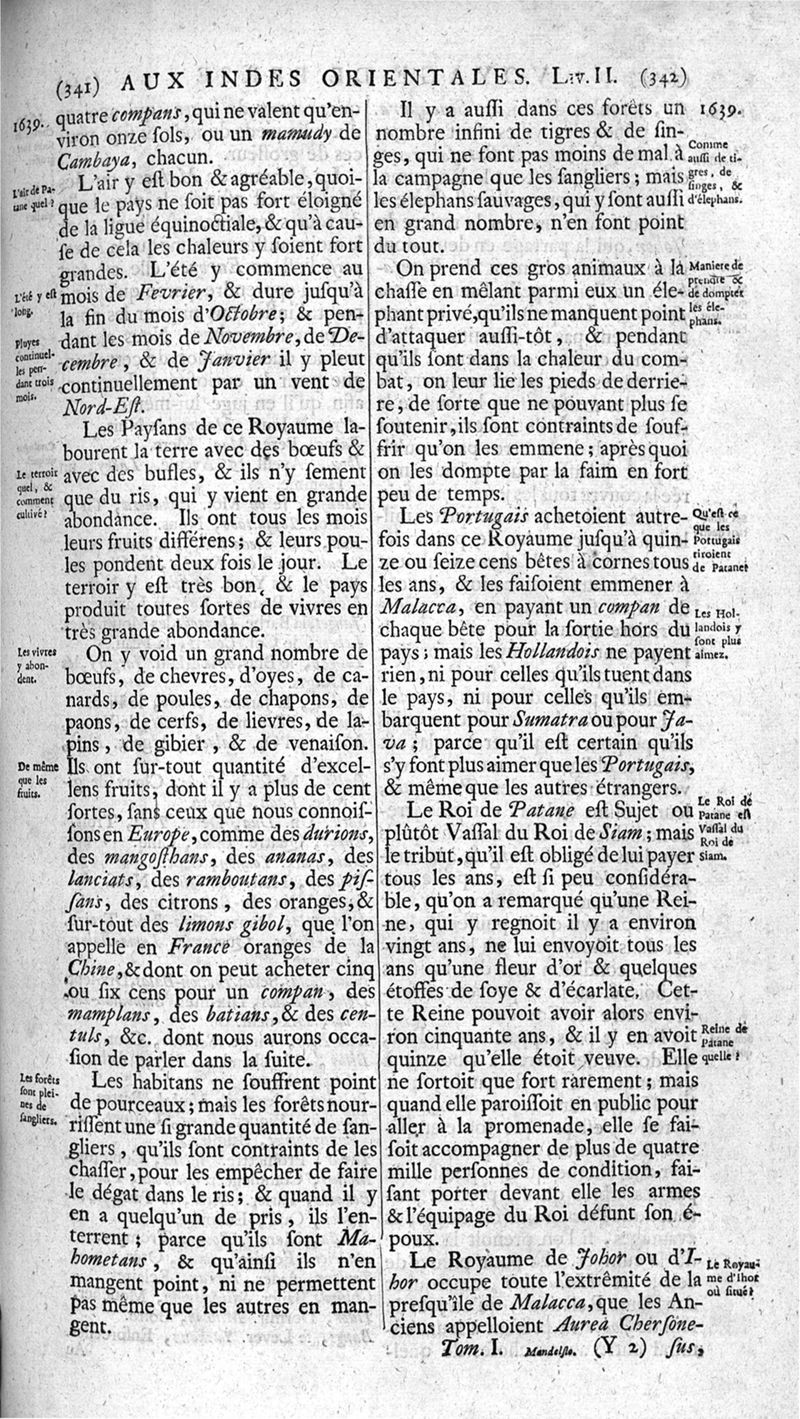 Voyages celebres & remarquables, faits de Perse aux Indes Orientales, par le sr. Jean-Albert de Mandelslo, gentilhomme des ambassadeurs du duc de Holstein en Moscovie & Perse. Contenant une description nouvelle & très-curieuse de l'Indostan, de l'empire du Grand-Mogol, des îles & presqu'îles de l'Orient, des royaumes de Siam, du Japon, de la Chine, du Congo, &c. Où l'on trouve la situation exacte de tous ces pays & etats ; & où l'on rapporte assez au long le naturel, les moeurs, & les coutumes de leurs habitans; leur gouvernement politique & ecclesiastique; les raretez qui se rencontrent dans ces pays; & les ceremonies qu'on y observe. Mis en ordre & publiez, après la mort de l'illustre voyageur, par le sr. Adam Olearius... Traduits de l'original par le sr. A. De Wicquefort ... Divisez en deux parties. Nouvelle edition revûe & corrigée exactement, augmentée considerablement, tant dans le corps de l'ouvrage qu'aux marginales, & surpassant en bonté & en beauté les précedentes editions. On y a encore ajouté des cartes géographiques, des représentations des villes, & autres taille-douces très-belles & très-exactes. On y trouve à la fin une Table fort ample & fort exacte. Tome premier [-second].