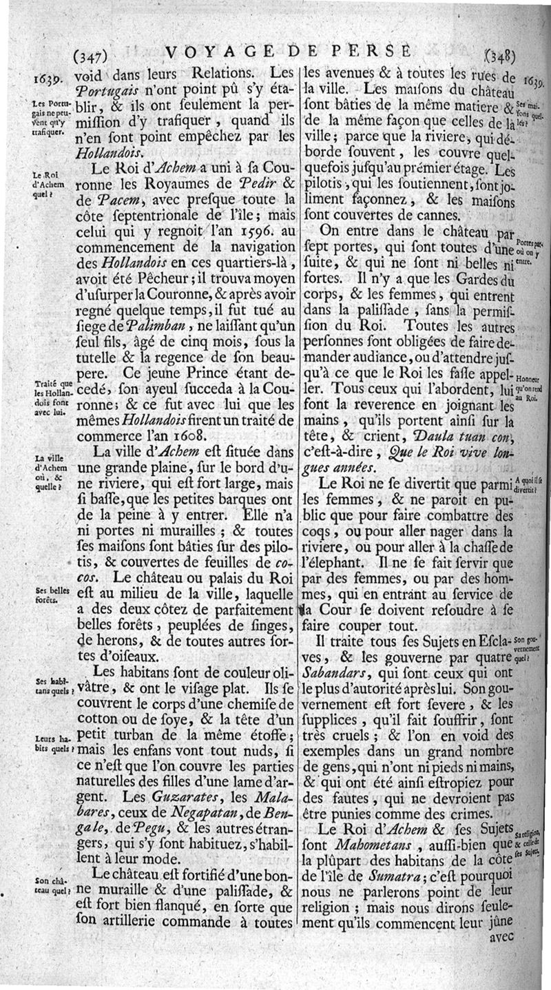 Voyages celebres & remarquables, faits de Perse aux Indes Orientales, par le sr. Jean-Albert de Mandelslo, gentilhomme des ambassadeurs du duc de Holstein en Moscovie & Perse. Contenant une description nouvelle & très-curieuse de l'Indostan, de l'empire du Grand-Mogol, des îles & presqu'îles de l'Orient, des royaumes de Siam, du Japon, de la Chine, du Congo, &c. Où l'on trouve la situation exacte de tous ces pays & etats ; & où l'on rapporte assez au long le naturel, les moeurs, & les coutumes de leurs habitans; leur gouvernement politique & ecclesiastique; les raretez qui se rencontrent dans ces pays; & les ceremonies qu'on y observe. Mis en ordre & publiez, après la mort de l'illustre voyageur, par le sr. Adam Olearius... Traduits de l'original par le sr. A. De Wicquefort ... Divisez en deux parties. Nouvelle edition revûe & corrigée exactement, augmentée considerablement, tant dans le corps de l'ouvrage qu'aux marginales, & surpassant en bonté & en beauté les précedentes editions. On y a encore ajouté des cartes géographiques, des représentations des villes, & autres taille-douces très-belles & très-exactes. On y trouve à la fin une Table fort ample & fort exacte. Tome premier [-second].