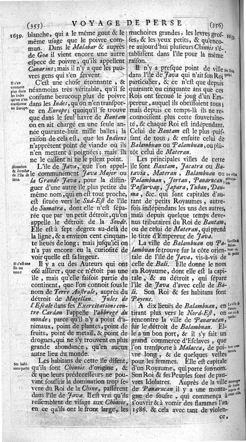 Voyages celebres & remarquables, faits de Perse aux Indes Orientales, par le sr. Jean-Albert de Mandelslo, gentilhomme des ambassadeurs du duc de Holstein en Moscovie & Perse. Contenant une description nouvelle & très-curieuse de l'Indostan, de l'empire du Grand-Mogol, des îles & presqu'îles de l'Orient, des royaumes de Siam, du Japon, de la Chine, du Congo, &c. Où l'on trouve la situation exacte de tous ces pays & etats ; & où l'on rapporte assez au long le naturel, les moeurs, & les coutumes de leurs habitans; leur gouvernement politique & ecclesiastique; les raretez qui se rencontrent dans ces pays; & les ceremonies qu'on y observe. Mis en ordre & publiez, après la mort de l'illustre voyageur, par le sr. Adam Olearius... Traduits de l'original par le sr. A. De Wicquefort ... Divisez en deux parties. Nouvelle edition revûe & corrigée exactement, augmentée considerablement, tant dans le corps de l'ouvrage qu'aux marginales, & surpassant en bonté & en beauté les précedentes editions. On y a encore ajouté des cartes géographiques, des représentations des villes, & autres taille-douces très-belles & très-exactes. On y trouve à la fin une Table fort ample & fort exacte. Tome premier [-second].