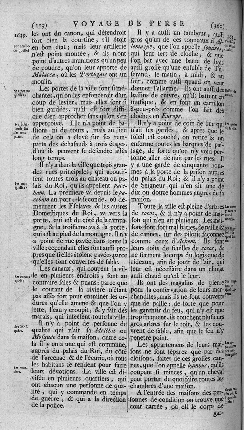 Voyages celebres & remarquables, faits de Perse aux Indes Orientales, par le sr. Jean-Albert de Mandelslo, gentilhomme des ambassadeurs du duc de Holstein en Moscovie & Perse. Contenant une description nouvelle & très-curieuse de l'Indostan, de l'empire du Grand-Mogol, des îles & presqu'îles de l'Orient, des royaumes de Siam, du Japon, de la Chine, du Congo, &c. Où l'on trouve la situation exacte de tous ces pays & etats ; & où l'on rapporte assez au long le naturel, les moeurs, & les coutumes de leurs habitans; leur gouvernement politique & ecclesiastique; les raretez qui se rencontrent dans ces pays; & les ceremonies qu'on y observe. Mis en ordre & publiez, après la mort de l'illustre voyageur, par le sr. Adam Olearius... Traduits de l'original par le sr. A. De Wicquefort ... Divisez en deux parties. Nouvelle edition revûe & corrigée exactement, augmentée considerablement, tant dans le corps de l'ouvrage qu'aux marginales, & surpassant en bonté & en beauté les précedentes editions. On y a encore ajouté des cartes géographiques, des représentations des villes, & autres taille-douces très-belles & très-exactes. On y trouve à la fin une Table fort ample & fort exacte. Tome premier [-second].