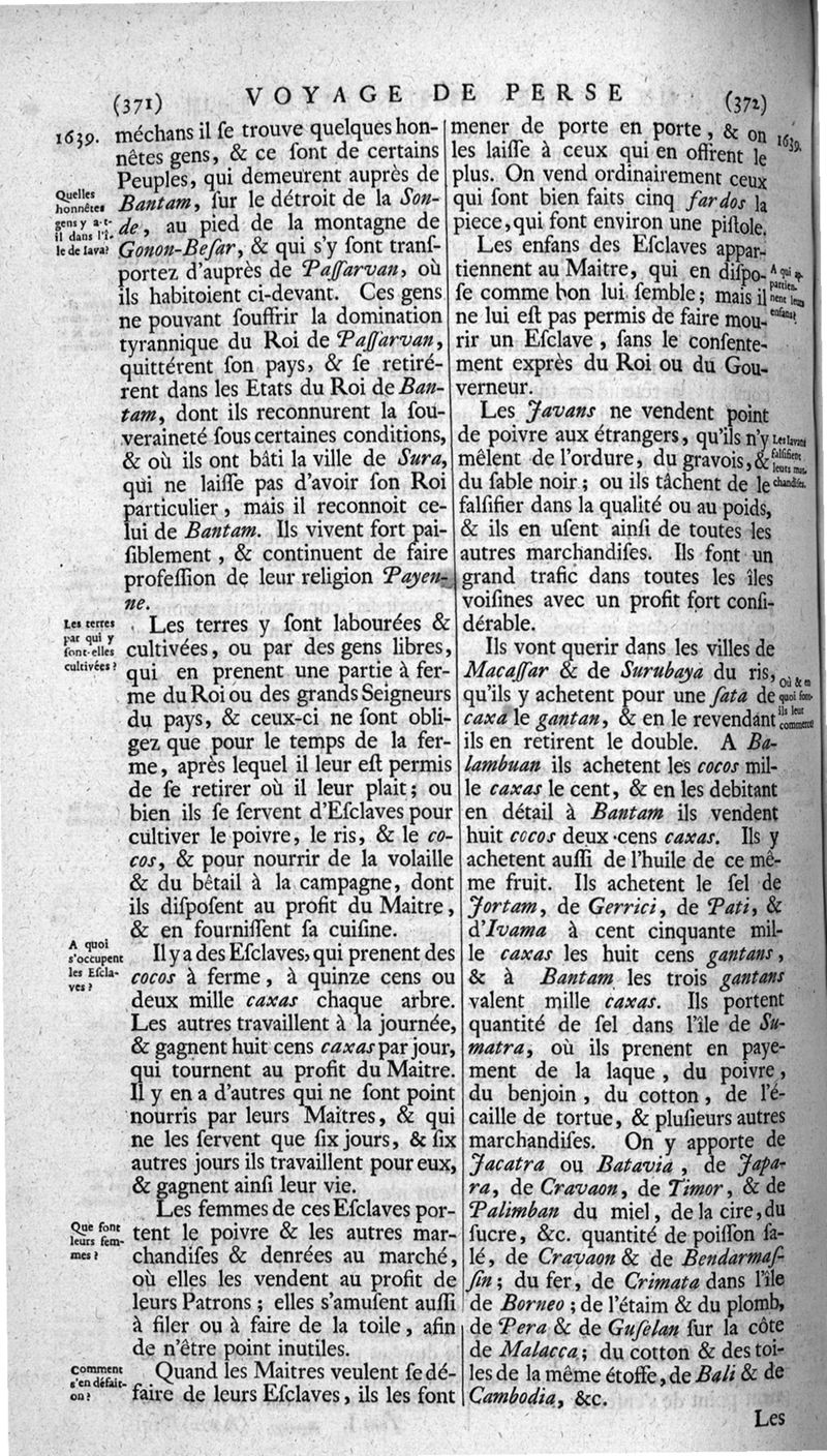 Voyages celebres & remarquables, faits de Perse aux Indes Orientales, par le sr. Jean-Albert de Mandelslo, gentilhomme des ambassadeurs du duc de Holstein en Moscovie & Perse. Contenant une description nouvelle & très-curieuse de l'Indostan, de l'empire du Grand-Mogol, des îles & presqu'îles de l'Orient, des royaumes de Siam, du Japon, de la Chine, du Congo, &c. Où l'on trouve la situation exacte de tous ces pays & etats ; & où l'on rapporte assez au long le naturel, les moeurs, & les coutumes de leurs habitans; leur gouvernement politique & ecclesiastique; les raretez qui se rencontrent dans ces pays; & les ceremonies qu'on y observe. Mis en ordre & publiez, après la mort de l'illustre voyageur, par le sr. Adam Olearius... Traduits de l'original par le sr. A. De Wicquefort ... Divisez en deux parties. Nouvelle edition revûe & corrigée exactement, augmentée considerablement, tant dans le corps de l'ouvrage qu'aux marginales, & surpassant en bonté & en beauté les précedentes editions. On y a encore ajouté des cartes géographiques, des représentations des villes, & autres taille-douces très-belles & très-exactes. On y trouve à la fin une Table fort ample & fort exacte. Tome premier [-second].
