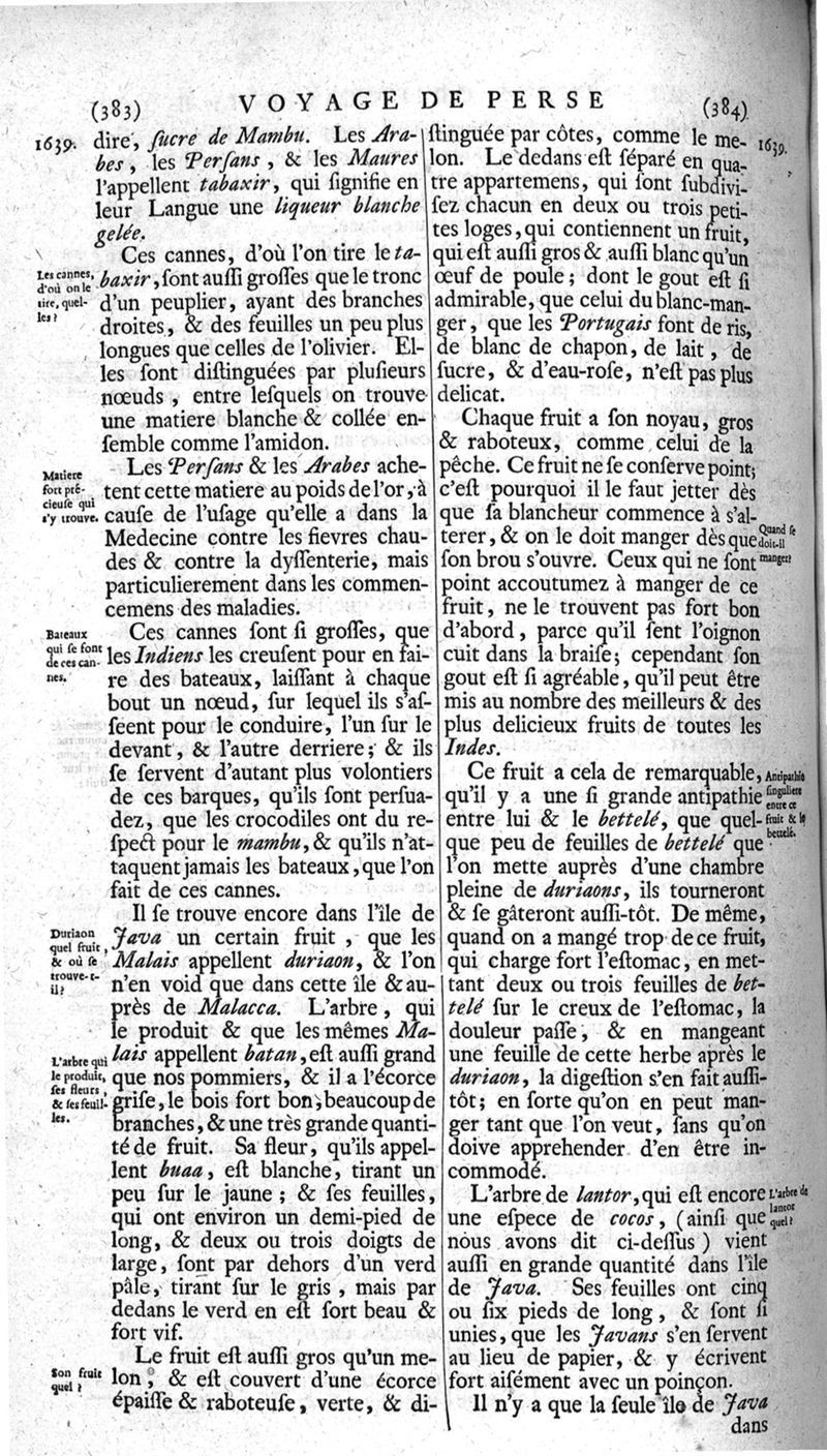 Voyages celebres & remarquables, faits de Perse aux Indes Orientales, par le sr. Jean-Albert de Mandelslo, gentilhomme des ambassadeurs du duc de Holstein en Moscovie & Perse. Contenant une description nouvelle & très-curieuse de l'Indostan, de l'empire du Grand-Mogol, des îles & presqu'îles de l'Orient, des royaumes de Siam, du Japon, de la Chine, du Congo, &c. Où l'on trouve la situation exacte de tous ces pays & etats ; & où l'on rapporte assez au long le naturel, les moeurs, & les coutumes de leurs habitans; leur gouvernement politique & ecclesiastique; les raretez qui se rencontrent dans ces pays; & les ceremonies qu'on y observe. Mis en ordre & publiez, après la mort de l'illustre voyageur, par le sr. Adam Olearius... Traduits de l'original par le sr. A. De Wicquefort ... Divisez en deux parties. Nouvelle edition revûe & corrigée exactement, augmentée considerablement, tant dans le corps de l'ouvrage qu'aux marginales, & surpassant en bonté & en beauté les précedentes editions. On y a encore ajouté des cartes géographiques, des représentations des villes, & autres taille-douces très-belles & très-exactes. On y trouve à la fin une Table fort ample & fort exacte. Tome premier [-second].