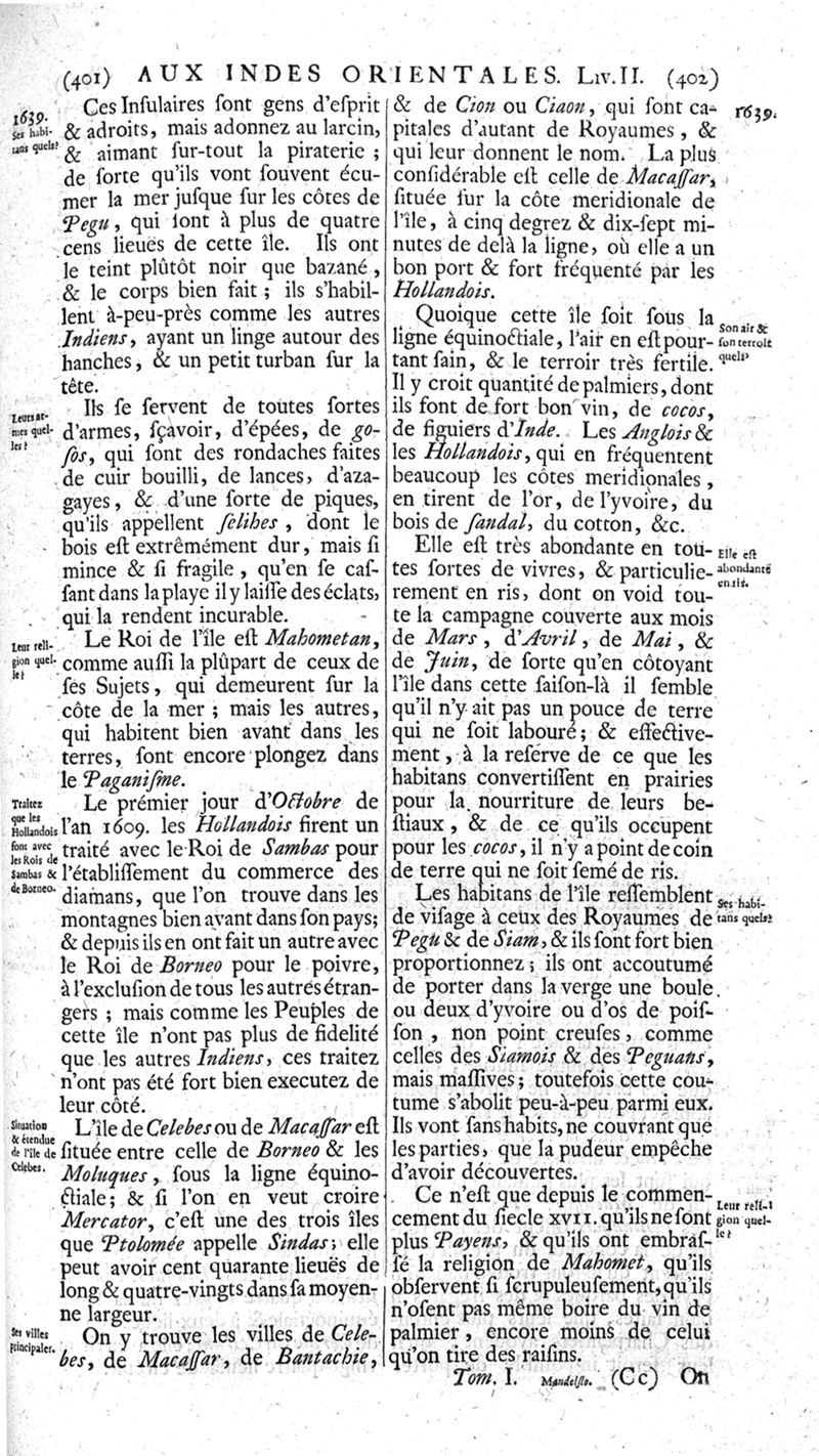 Voyages celebres & remarquables, faits de Perse aux Indes Orientales, par le sr. Jean-Albert de Mandelslo, gentilhomme des ambassadeurs du duc de Holstein en Moscovie & Perse. Contenant une description nouvelle & très-curieuse de l'Indostan, de l'empire du Grand-Mogol, des îles & presqu'îles de l'Orient, des royaumes de Siam, du Japon, de la Chine, du Congo, &c. Où l'on trouve la situation exacte de tous ces pays & etats ; & où l'on rapporte assez au long le naturel, les moeurs, & les coutumes de leurs habitans; leur gouvernement politique & ecclesiastique; les raretez qui se rencontrent dans ces pays; & les ceremonies qu'on y observe. Mis en ordre & publiez, après la mort de l'illustre voyageur, par le sr. Adam Olearius... Traduits de l'original par le sr. A. De Wicquefort ... Divisez en deux parties. Nouvelle edition revûe & corrigée exactement, augmentée considerablement, tant dans le corps de l'ouvrage qu'aux marginales, & surpassant en bonté & en beauté les précedentes editions. On y a encore ajouté des cartes géographiques, des représentations des villes, & autres taille-douces très-belles & très-exactes. On y trouve à la fin une Table fort ample & fort exacte. Tome premier [-second].