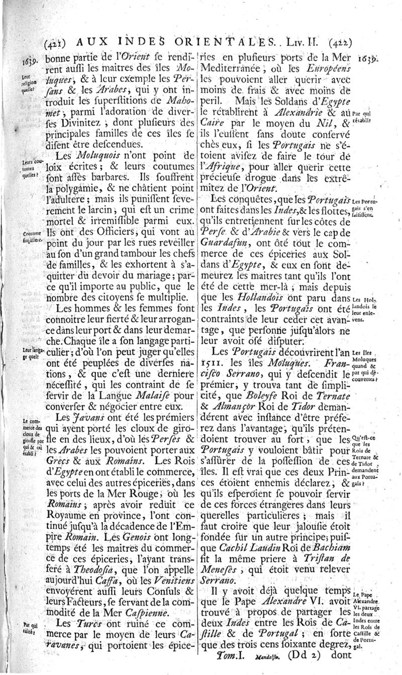 Voyages celebres & remarquables, faits de Perse aux Indes Orientales, par le sr. Jean-Albert de Mandelslo, gentilhomme des ambassadeurs du duc de Holstein en Moscovie & Perse. Contenant une description nouvelle & très-curieuse de l'Indostan, de l'empire du Grand-Mogol, des îles & presqu'îles de l'Orient, des royaumes de Siam, du Japon, de la Chine, du Congo, &c. Où l'on trouve la situation exacte de tous ces pays & etats ; & où l'on rapporte assez au long le naturel, les moeurs, & les coutumes de leurs habitans; leur gouvernement politique & ecclesiastique; les raretez qui se rencontrent dans ces pays; & les ceremonies qu'on y observe. Mis en ordre & publiez, après la mort de l'illustre voyageur, par le sr. Adam Olearius... Traduits de l'original par le sr. A. De Wicquefort ... Divisez en deux parties. Nouvelle edition revûe & corrigée exactement, augmentée considerablement, tant dans le corps de l'ouvrage qu'aux marginales, & surpassant en bonté & en beauté les précedentes editions. On y a encore ajouté des cartes géographiques, des représentations des villes, & autres taille-douces très-belles & très-exactes. On y trouve à la fin une Table fort ample & fort exacte. Tome premier [-second].