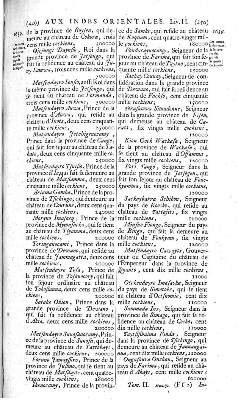 Voyages celebres & remarquables, faits de Perse aux Indes Orientales, par le sr. Jean-Albert de Mandelslo, gentilhomme des ambassadeurs du duc de Holstein en Moscovie & Perse. Contenant une description nouvelle & très-curieuse de l'Indostan, de l'empire du Grand-Mogol, des îles & presqu'îles de l'Orient, des royaumes de Siam, du Japon, de la Chine, du Congo, &c. Où l'on trouve la situation exacte de tous ces pays & etats ; & où l'on rapporte assez au long le naturel, les moeurs, & les coutumes de leurs habitans; leur gouvernement politique & ecclesiastique; les raretez qui se rencontrent dans ces pays; & les ceremonies qu'on y observe. Mis en ordre & publiez, après la mort de l'illustre voyageur, par le sr. Adam Olearius... Traduits de l'original par le sr. A. De Wicquefort ... Divisez en deux parties. Nouvelle edition revûe & corrigée exactement, augmentée considerablement, tant dans le corps de l'ouvrage qu'aux marginales, & surpassant en bonté & en beauté les précedentes editions. On y a encore ajouté des cartes géographiques, des représentations des villes, & autres taille-douces très-belles & très-exactes. On y trouve à la fin une Table fort ample & fort exacte. Tome premier [-second].