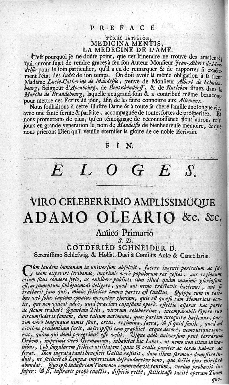 Voyages celebres & remarquables, faits de Perse aux Indes Orientales, par le sr. Jean-Albert de Mandelslo, gentilhomme des ambassadeurs du duc de Holstein en Moscovie & Perse. Contenant une description nouvelle & très-curieuse de l'Indostan, de l'empire du Grand-Mogol, des îles & presqu'îles de l'Orient, des royaumes de Siam, du Japon, de la Chine, du Congo, &c. Où l'on trouve la situation exacte de tous ces pays & etats ; & où l'on rapporte assez au long le naturel, les moeurs, & les coutumes de leurs habitans; leur gouvernement politique & ecclesiastique; les raretez qui se rencontrent dans ces pays; & les ceremonies qu'on y observe. Mis en ordre & publiez, après la mort de l'illustre voyageur, par le sr. Adam Olearius... Traduits de l'original par le sr. A. De Wicquefort ... Divisez en deux parties. Nouvelle edition revûe & corrigée exactement, augmentée considerablement, tant dans le corps de l'ouvrage qu'aux marginales, & surpassant en bonté & en beauté les précedentes editions. On y a encore ajouté des cartes géographiques, des représentations des villes, & autres taille-douces très-belles & très-exactes. On y trouve à la fin une Table fort ample & fort exacte. Tome premier [-second].