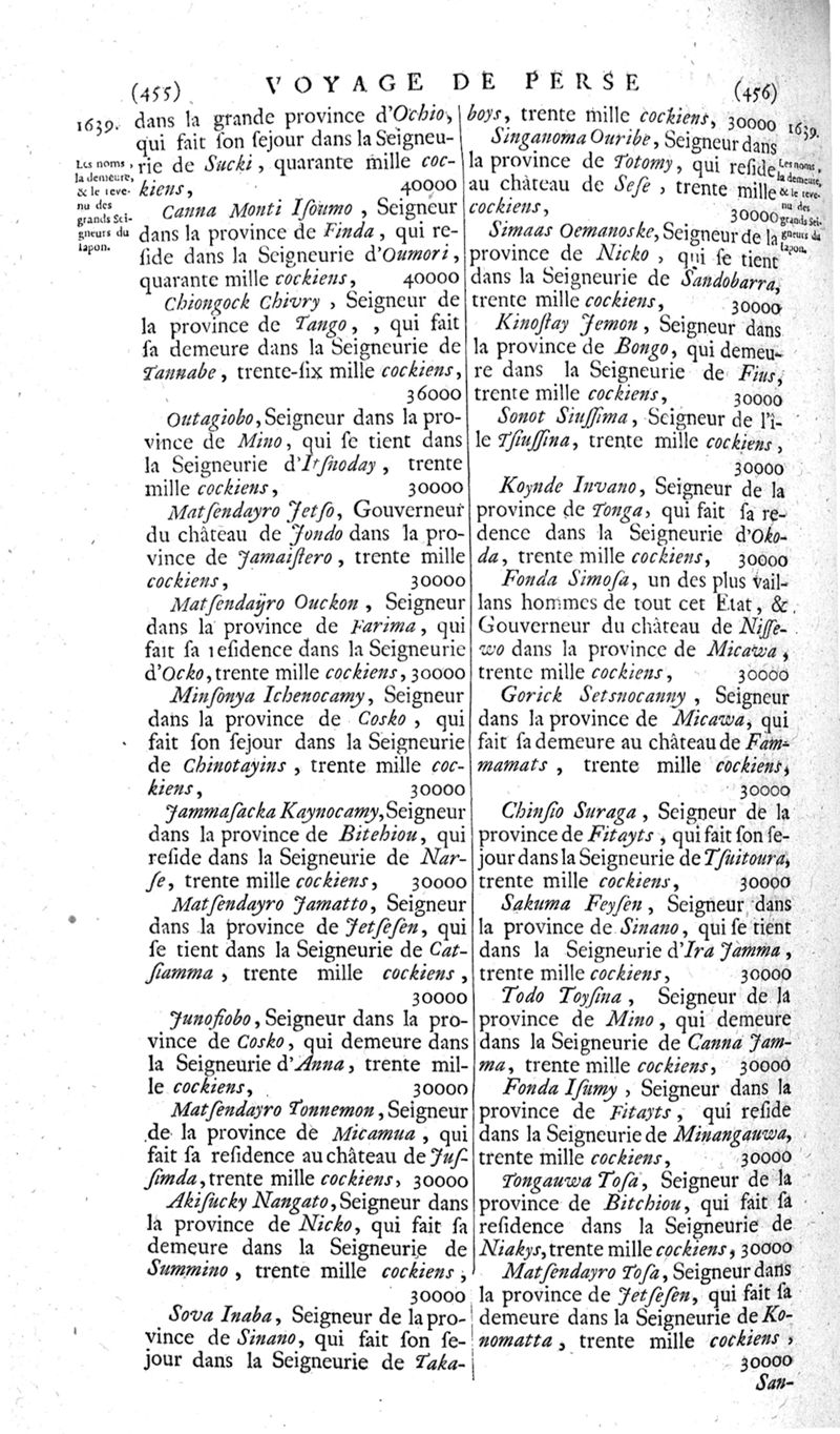 Voyages celebres & remarquables, faits de Perse aux Indes Orientales, par le sr. Jean-Albert de Mandelslo, gentilhomme des ambassadeurs du duc de Holstein en Moscovie & Perse. Contenant une description nouvelle & très-curieuse de l'Indostan, de l'empire du Grand-Mogol, des îles & presqu'îles de l'Orient, des royaumes de Siam, du Japon, de la Chine, du Congo, &c. Où l'on trouve la situation exacte de tous ces pays & etats ; & où l'on rapporte assez au long le naturel, les moeurs, & les coutumes de leurs habitans; leur gouvernement politique & ecclesiastique; les raretez qui se rencontrent dans ces pays; & les ceremonies qu'on y observe. Mis en ordre & publiez, après la mort de l'illustre voyageur, par le sr. Adam Olearius... Traduits de l'original par le sr. A. De Wicquefort ... Divisez en deux parties. Nouvelle edition revûe & corrigée exactement, augmentée considerablement, tant dans le corps de l'ouvrage qu'aux marginales, & surpassant en bonté & en beauté les précedentes editions. On y a encore ajouté des cartes géographiques, des représentations des villes, & autres taille-douces très-belles & très-exactes. On y trouve à la fin une Table fort ample & fort exacte. Tome premier [-second].